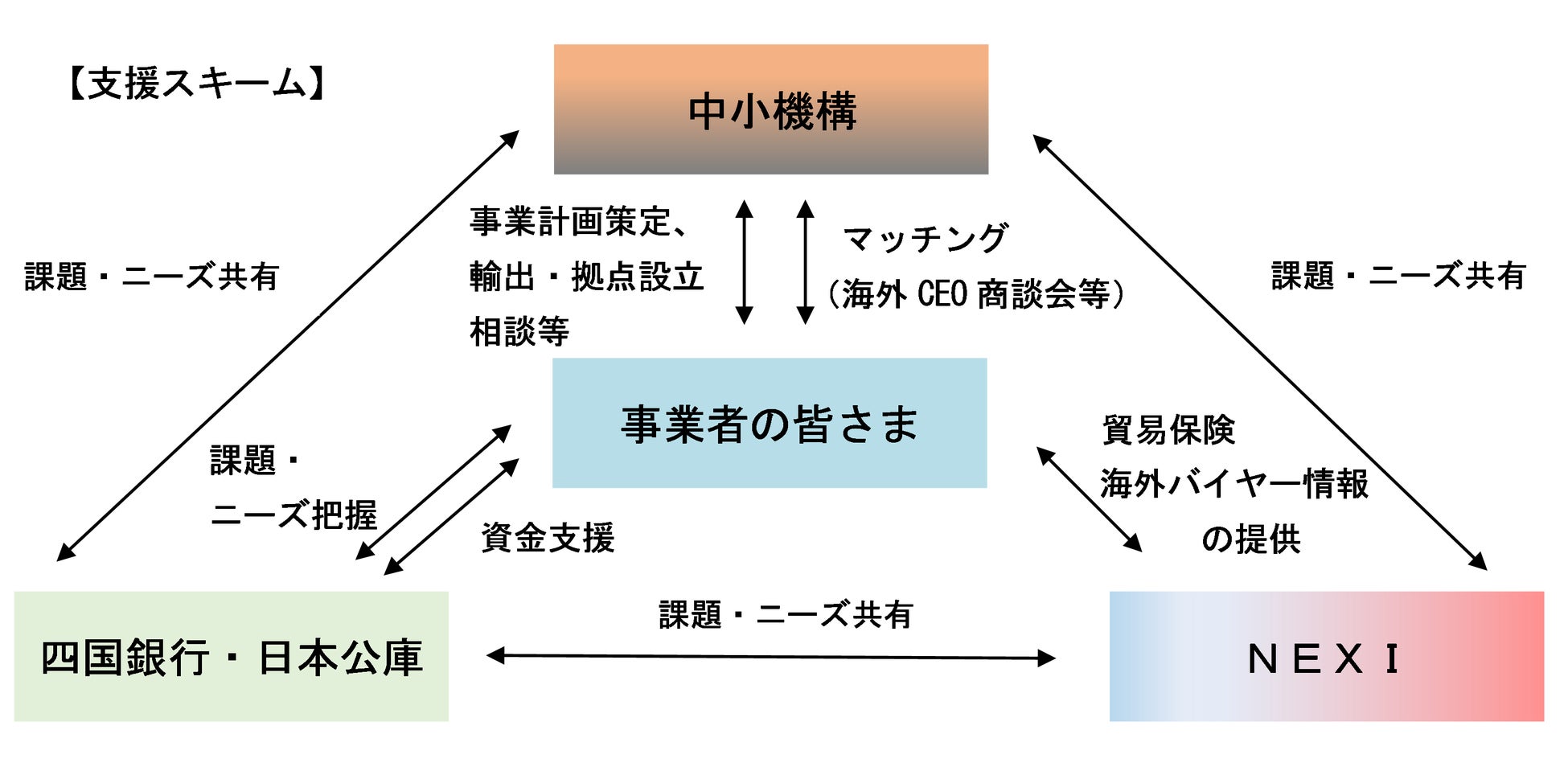 「海外ビジネス支援パッケージ」は、海外への販路開拓・拡大等を図るうえでの様々な課題に対する解決支援を行い円滑な海外展開の実現につなげるため、中小機構、日本公庫及びNEXIが令和4年12月に構築したもので、この度、本スキームに四国銀行が参加することになりました。