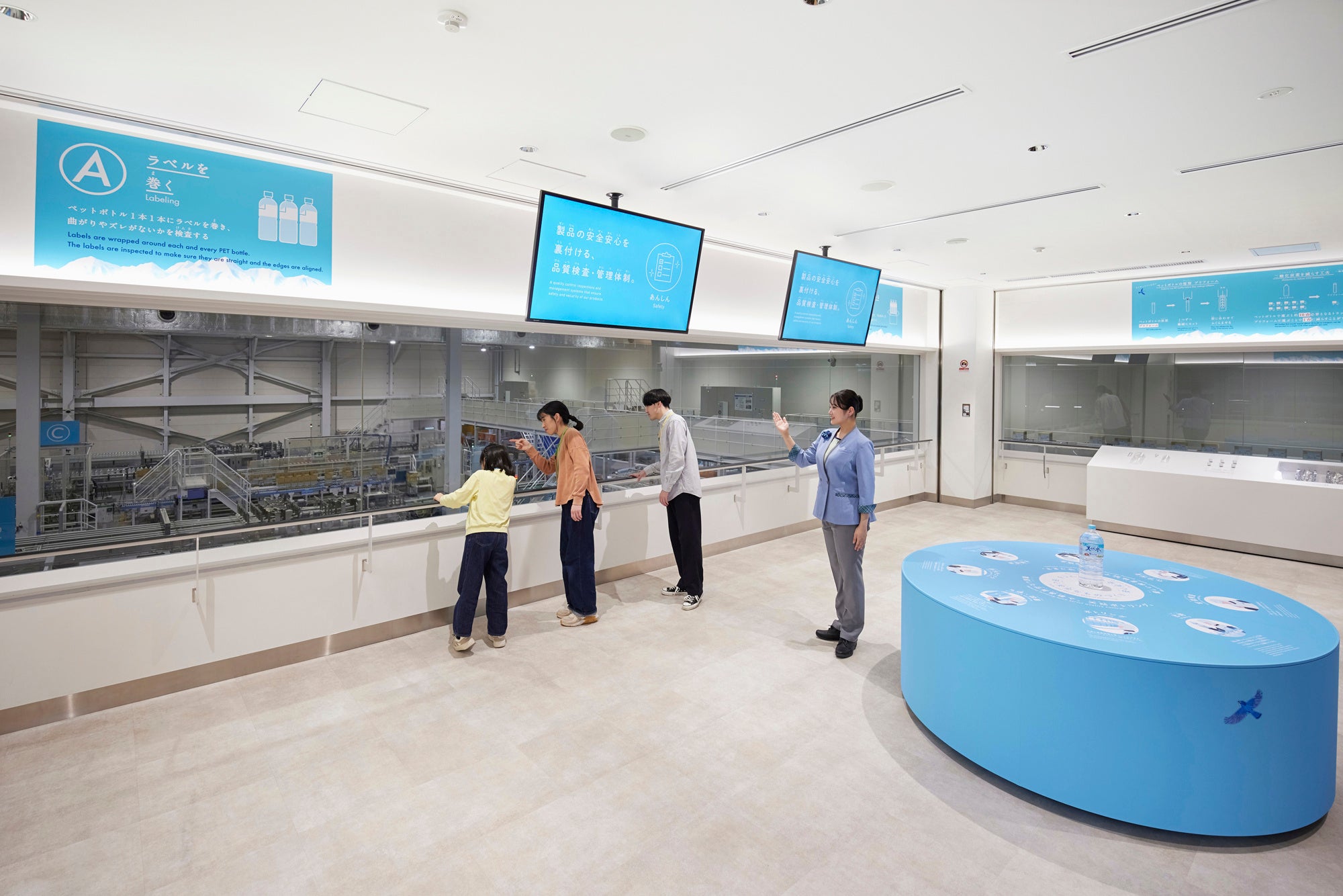 実際の製造ラインを間近に見ることができるエリアに展示台を新たに設置し、天然水工場での安全・安心なものづくりをご紹介します。おいしい「サントリー天然水」〈南アルプス〉を提供するために、細部までこだわる工場での取り組みについて、ご体感いただけます。