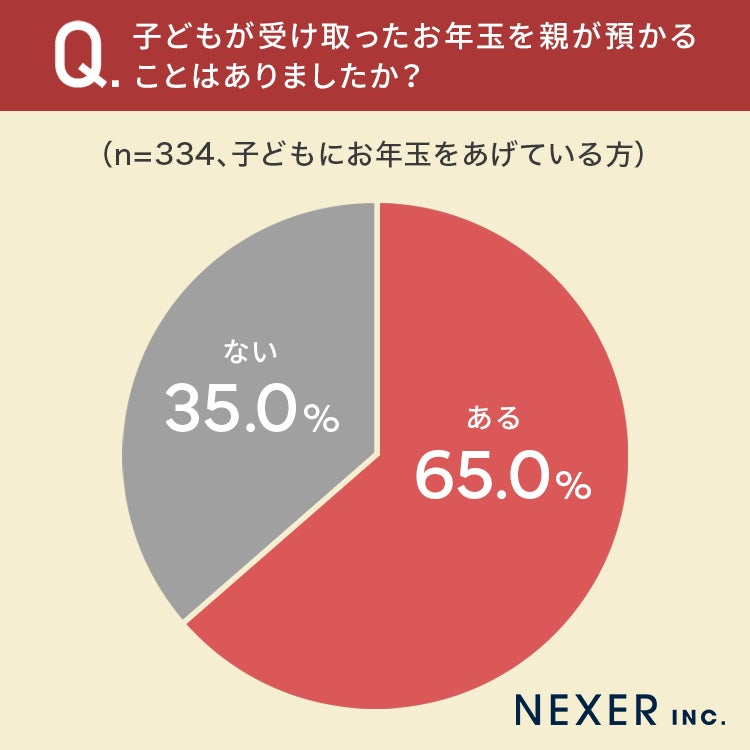 65%と半数以上の方が、子どもが受け取ったお年玉を親が預かることが「ある」と回答しています。
