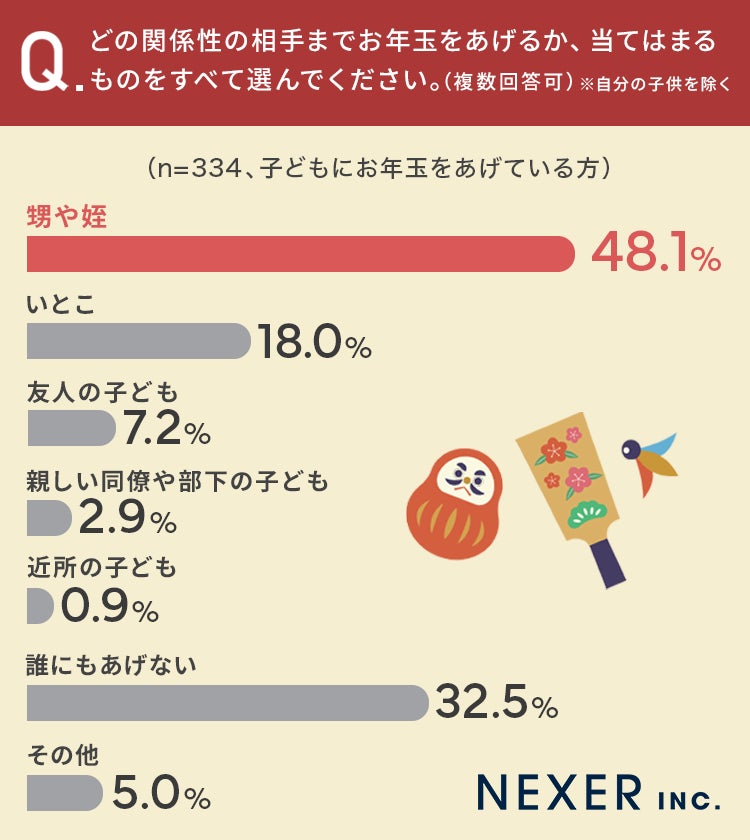 さらにどの関係性の相手までお年玉をあげるか、当てはまるものをすべて選んでもらいました。