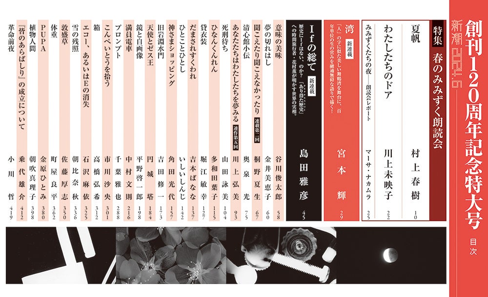 5月7日(火)に発売となるこの創刊120周年記念号(「新潮」6月号)には、海外の読者からもその新作が待ち望まれる村上春樹氏と川上未映子氏の短篇小説、宮本輝氏による一大サーガ「湾」、島田雅彦氏によるタイムトラベルSF「Ifの総て」の強力新連載をはじめ、総勢70名以上の日本を代表する作家たちが創作・随筆をお寄せいただきました。