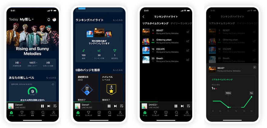 LINE MUSICアプリ上にアーティストの専用スペースを設定できる「My推し」は、楽曲の再生時間や再生回数、いいね数など、“応援”の積み重ねをファンレベルやグラフで可視化し、ユーザーがアーティストを応援する熱量を実感できる機能です。さらに、推しアーティストのランクイン状況の推移がチェックできる機能や、カバーイメージのカスタマイズ、アクティビティに応じた「バッジ」の獲得、獲得したバッジや推し曲等のシェア機能など、従来の“ただ聴くだけ”のサブスクリプション体験とは異なる新しい音楽体験を提供しています。