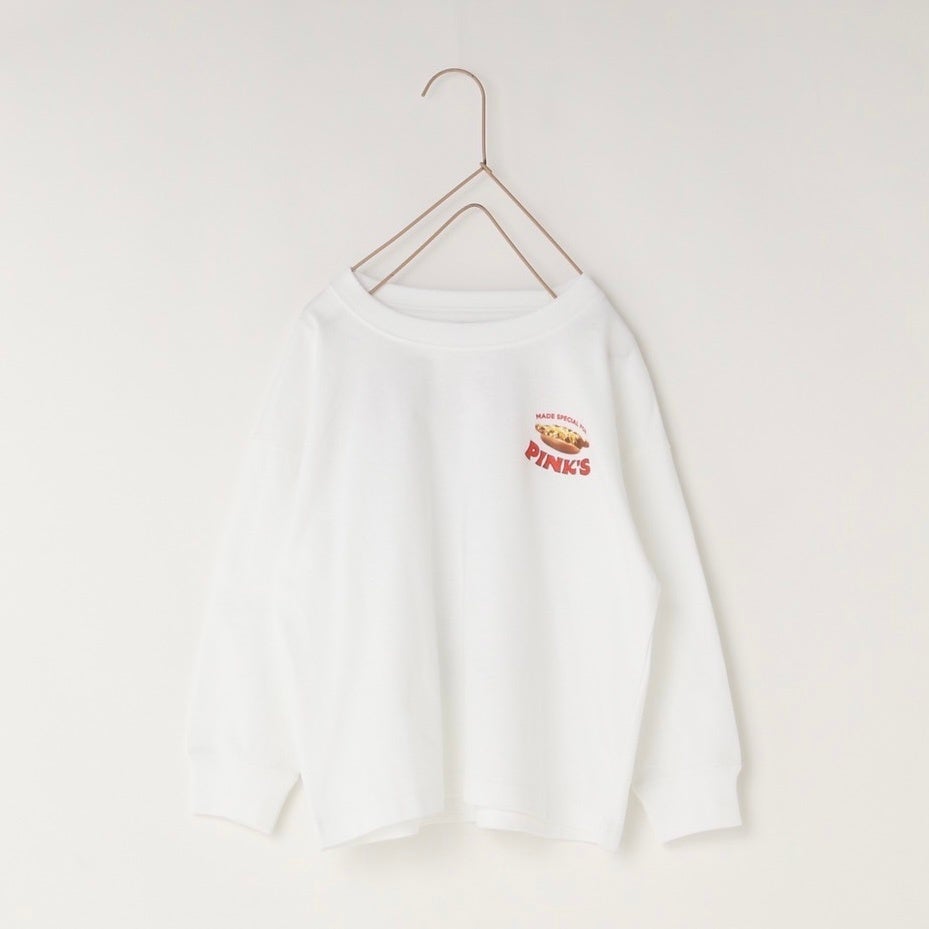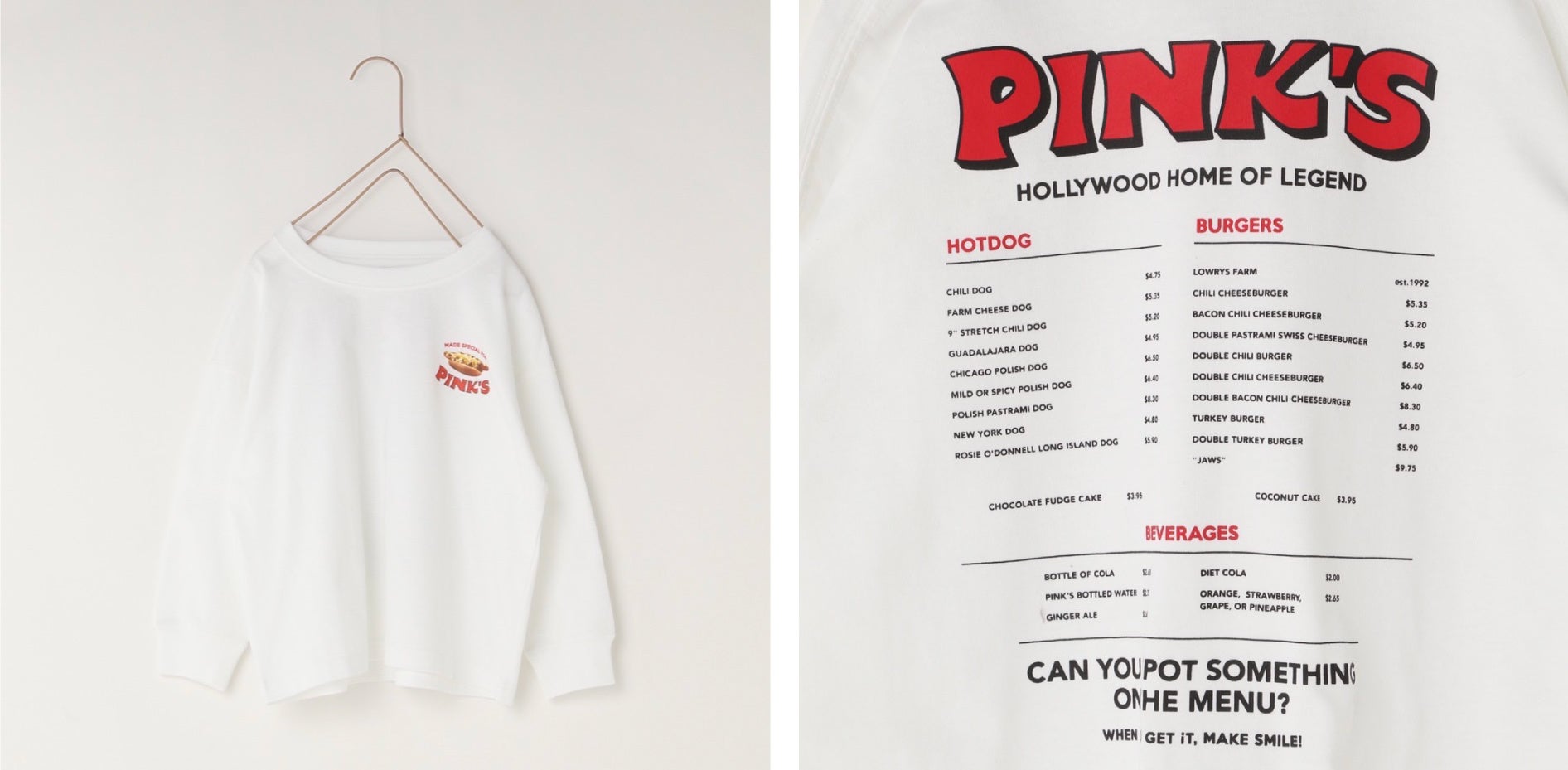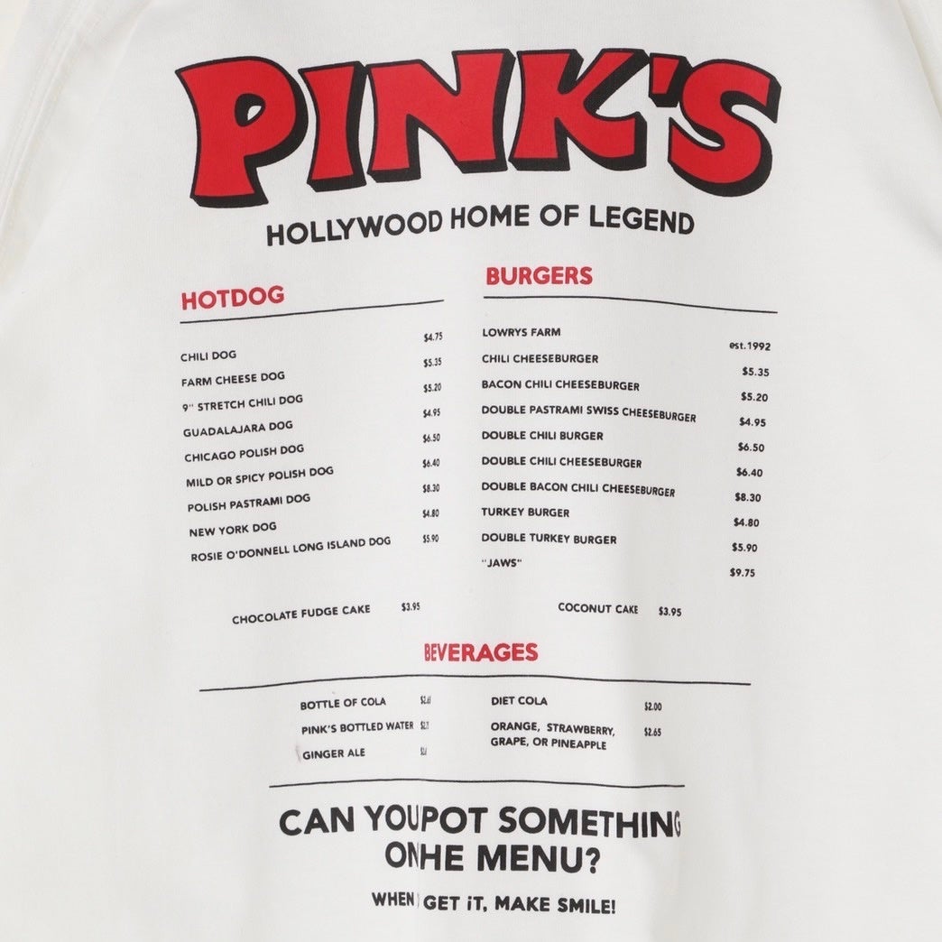 フロントにホットドッグ、バックにはPINKSのメニュー表がプリントされたロングTシャツ。