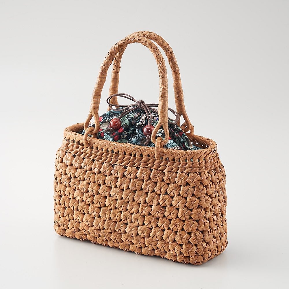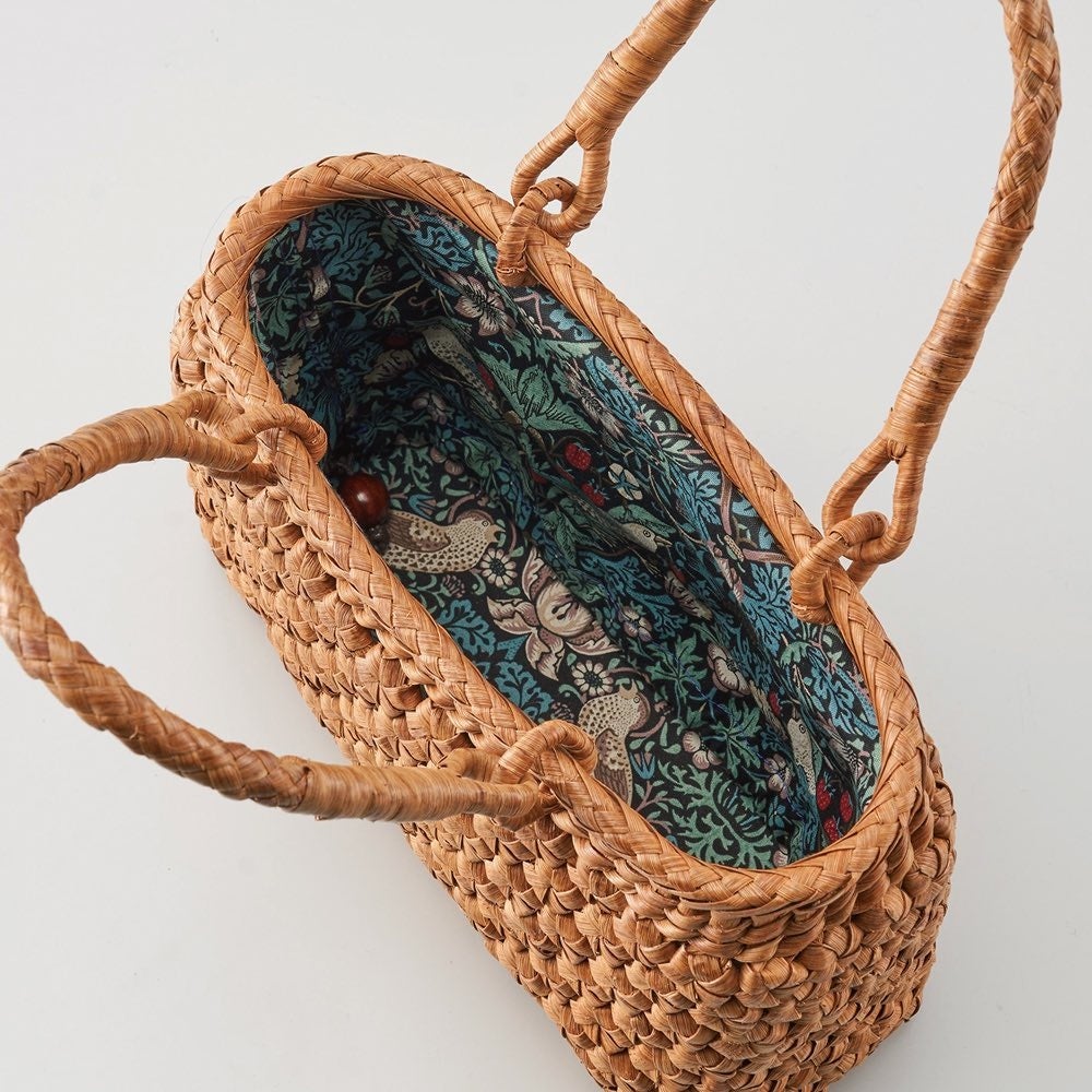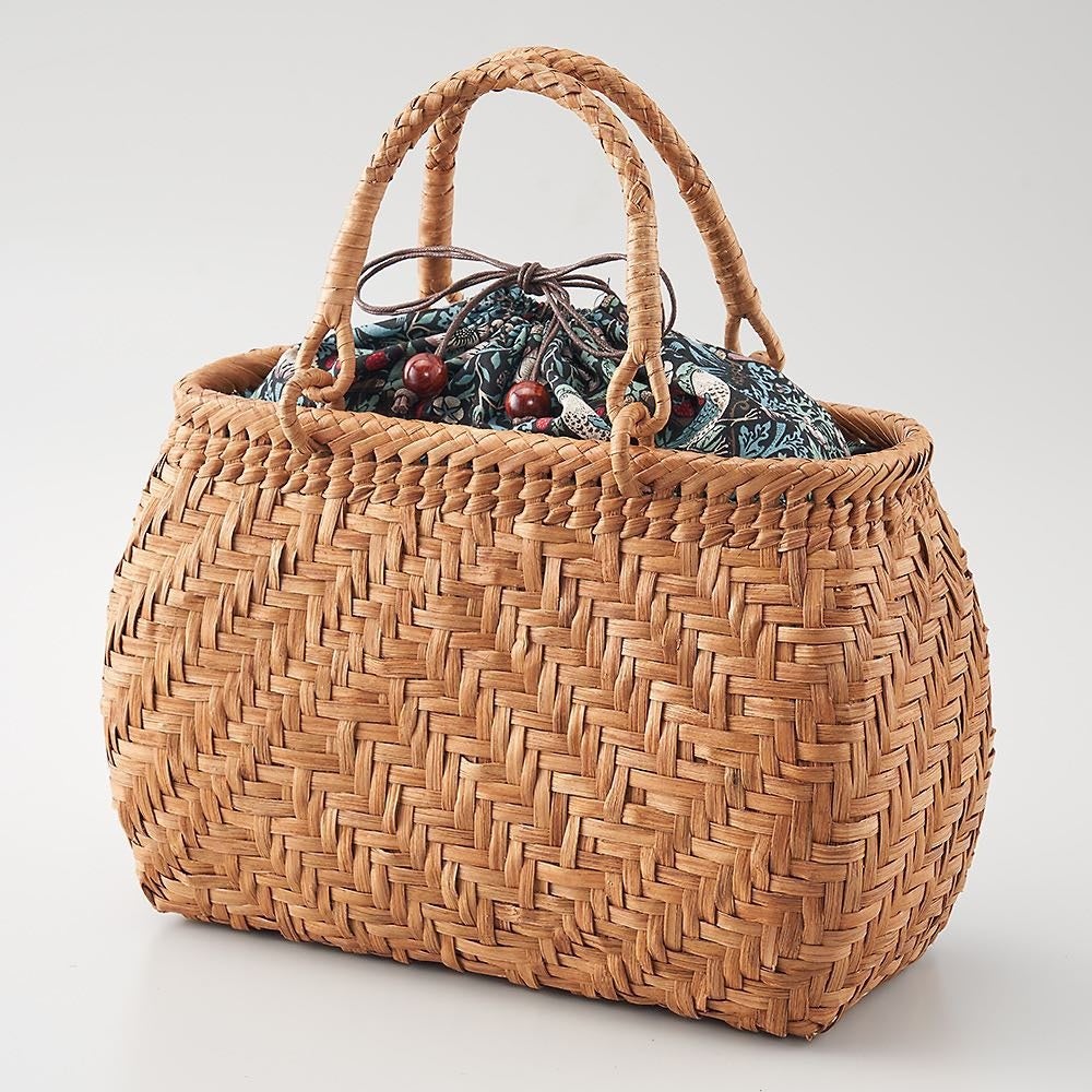 山葡萄の蔓の皮を職人が一つ一つ丁寧に編んだかごバック。素材の採取から完成まで全工程を手仕事で行うため1つを完成するまでに約半月を要します。日本では素材も職人も減ってきたことから今回は中国で手配しています。中国にて技術を習得した職人が作製しています。持ち手のつなぎ部分にはリングを配し、使いやすさと耐久性を向上するなど工夫を凝らしています。内布はモリスの<いちご泥棒>のファブリック。内側に縫い付けてあり外れることなく、内側に折り込めばオープンな状態で使用できます。