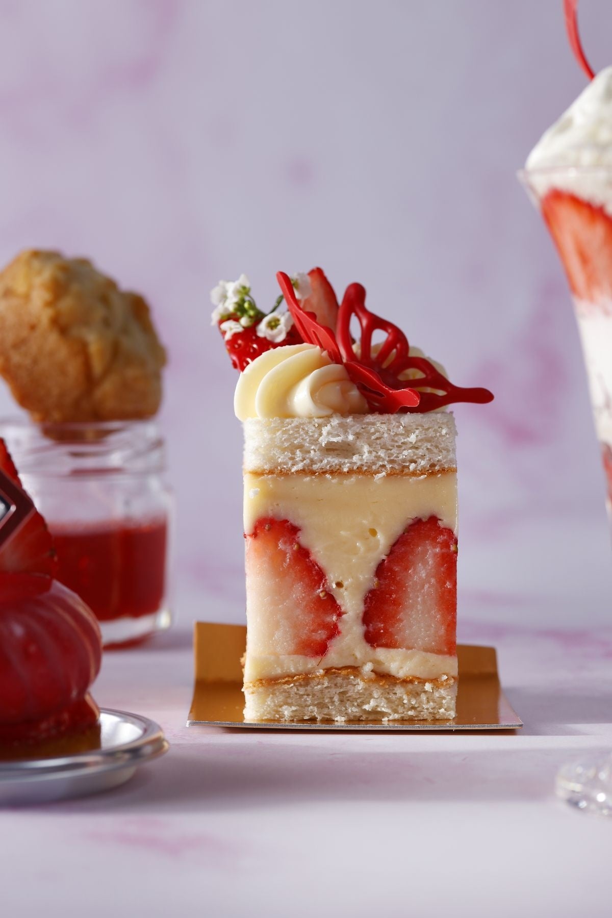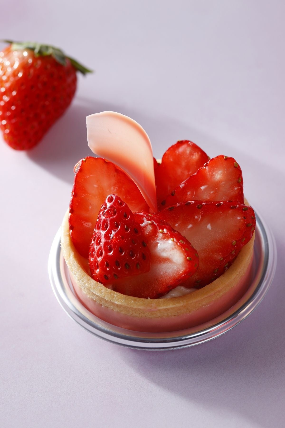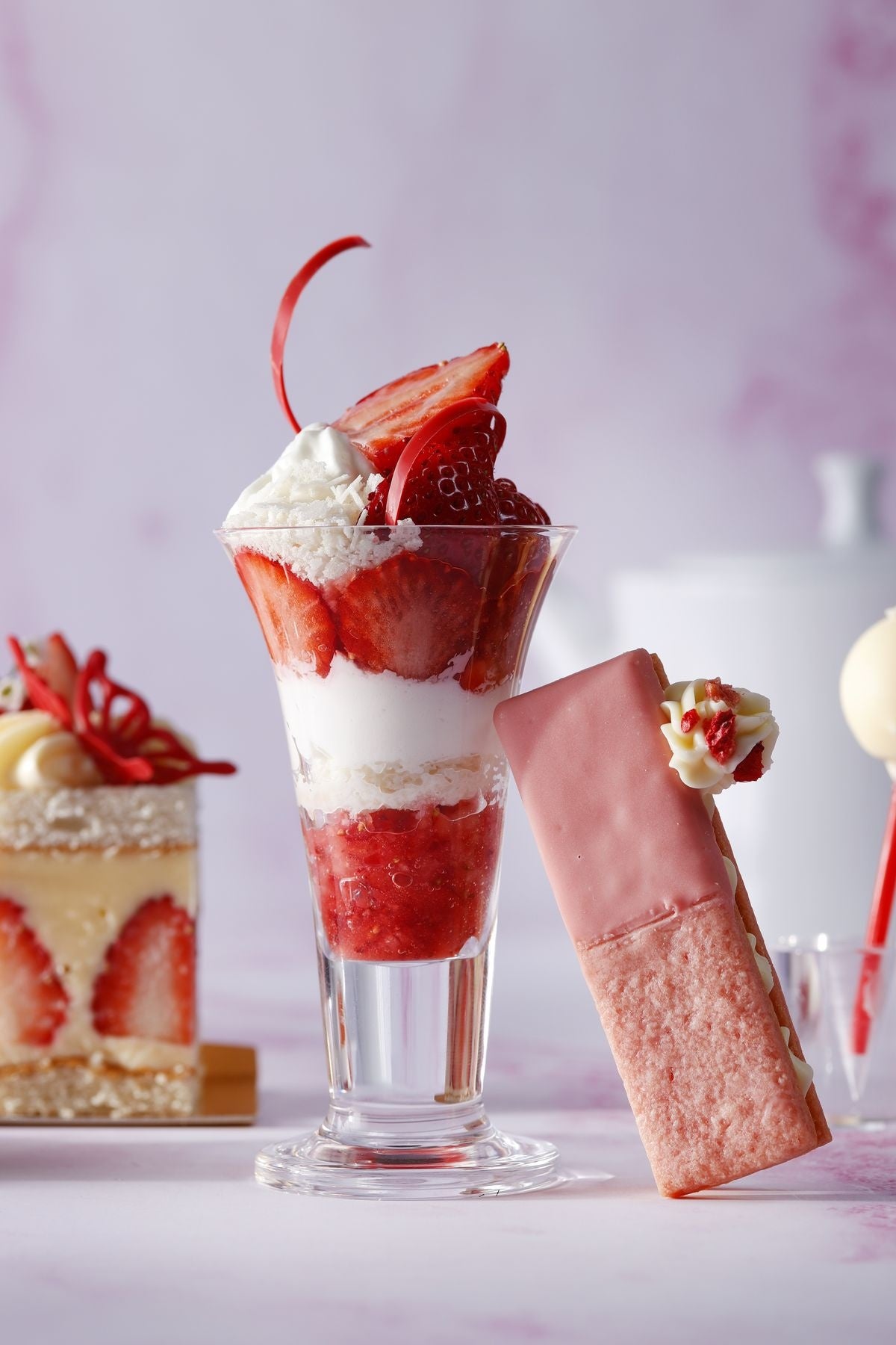 都会の中でも自然豊かな御殿山で、四季の移ろいを感じながらお楽しみいただく東京マリオットホテルのアフタヌーンティー。練乳いらずといわれるほど甘みが強い「あまりん」、甘みと酸味のバランスのとれた味わいが特徴の新品種いちご「べにたま」とホテル自家製ホワイトチョコレートを主役に据え、それぞれの味わいを存分に堪能いただけるスイーツとセイボリーがテーブルに並びます。スイーツスタンドには「あまりん」を用いたパフェやケーキ、「べにたま」をたっぷりと楽しめるタルトやクレームブリュレなど、それぞれのいちごのおいしさを引き出した8種がラインナップ。パティシエがいちごとの相性を見極め作り上げた上品な甘さのホワイトチョコレートと、「あまりん」「べにたま」が織りなす見た目も味わいも春らしい品々をお届けいたします。