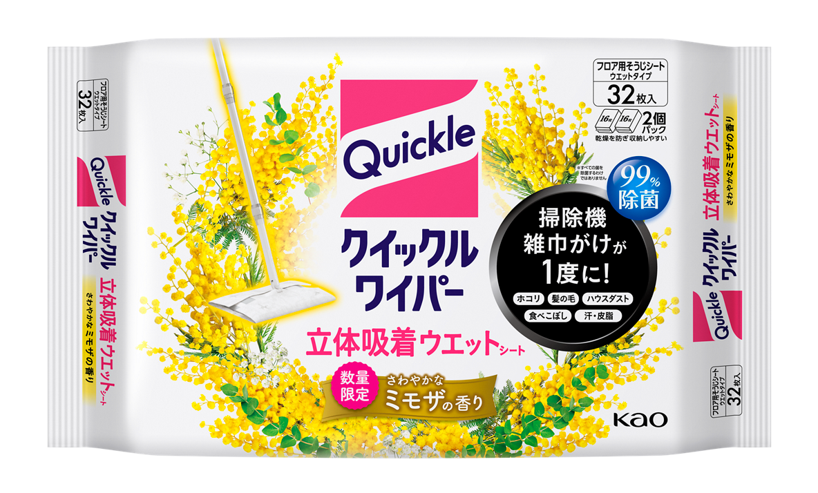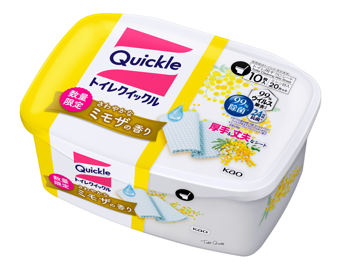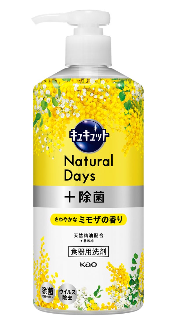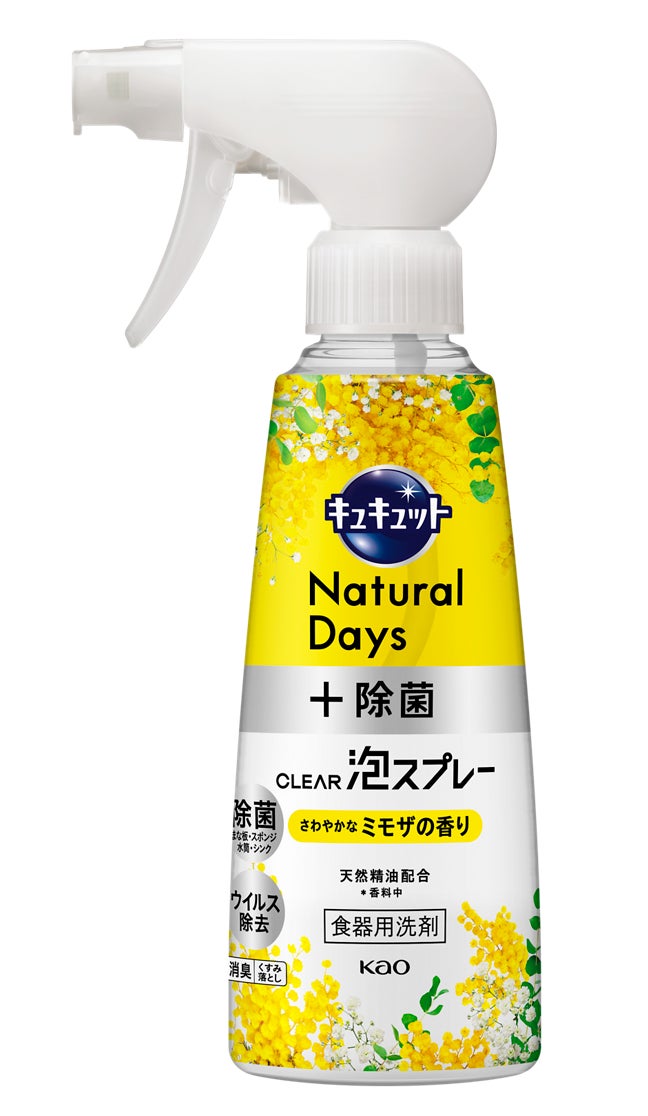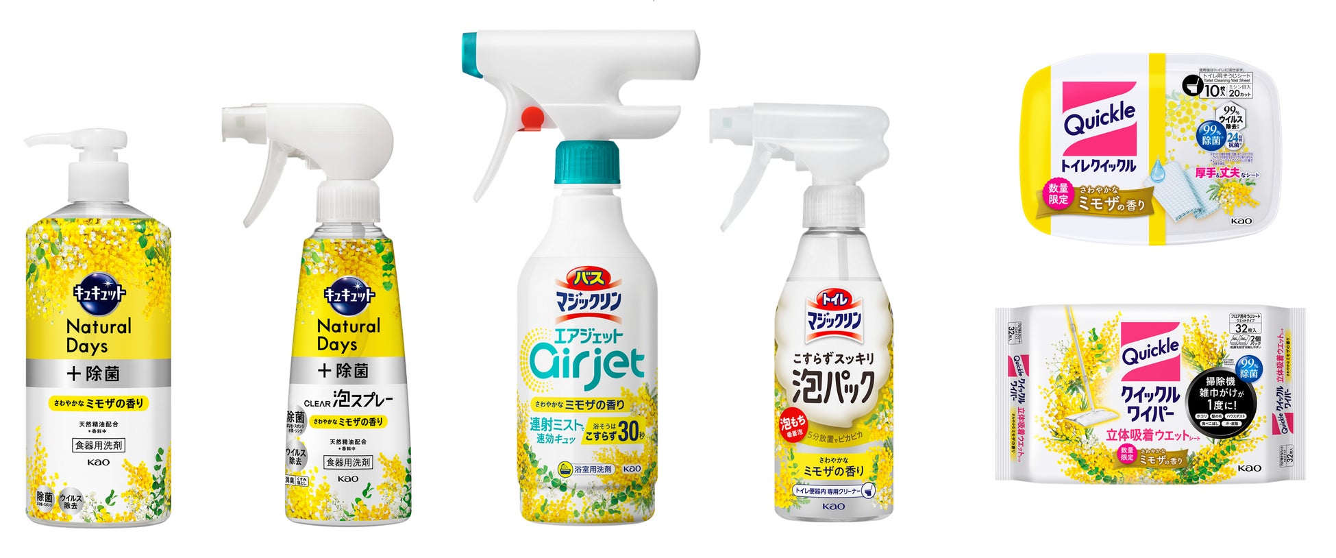 食器用洗剤「キュキュット Natural Days+除菌」「キュキュット Natural Days+除菌 CLEAR泡スプレー」、浴室用洗剤「バスマジックリン エアジェット」、トイレ便器内専用クリーナー「トイレマジックリン こすらずスッキリ泡パック」、トイレ用そうじシート「トイレクイックル」、フロア用そうじシート「クイックルワイパー 立体吸着ウエットシート」から、「ミモザの香り」を限定発売します。