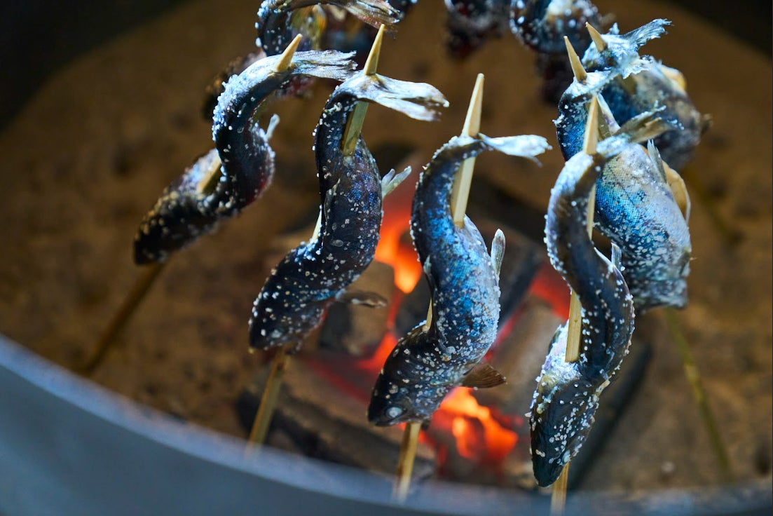 市民が暮らしで使用する水は100%地下水と、水が清らかなことで知られる「うきは市」。そのため渓流から引水した養殖池では“ヤマメ”が育てられています。この“ヤマメ”を使った塩焼きはじっくり約45分かけて炭火で焼かれ、頭から尾まで丸ごと食べられるおいしさ。特有の臭みがなく、脂がのって甘みのある味が楽しめます。