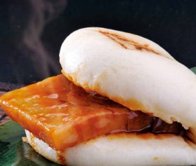 鹿児島県産の豚肉を、時間をかけてじっくりやわらかく煮込んでできる、とろとろの角煮。ふわふわ、手作りのパオで挟み込みました。
