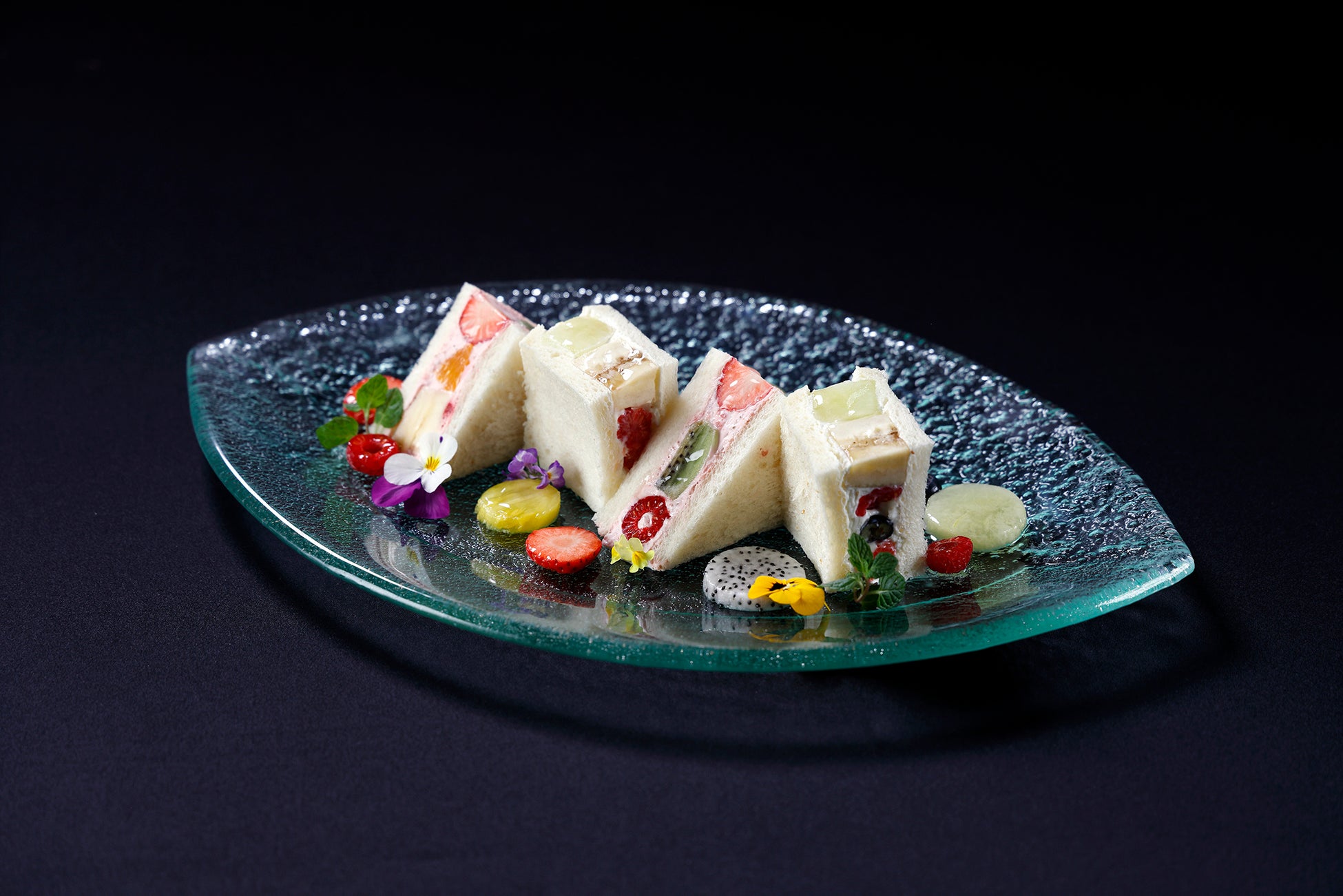 地元・大阪のベーカリーがこだわりの製法で作ったパンに、甘さと酸味のバランスの良い2種類の特製ヨーグルトクリーム (イチゴ、リンゴ) とフルーツを挟んだフルーツサンドウィッチ。ホテル開業10周年を記念して厳選した10種類の果実 (バナナ、イチゴ、キウイフルーツ、メロン、ルビーグレープフルーツ、ドラゴンフルーツ、パイナップル、ブルーベリー、ラズベリー、オレンジ)を使用しています。