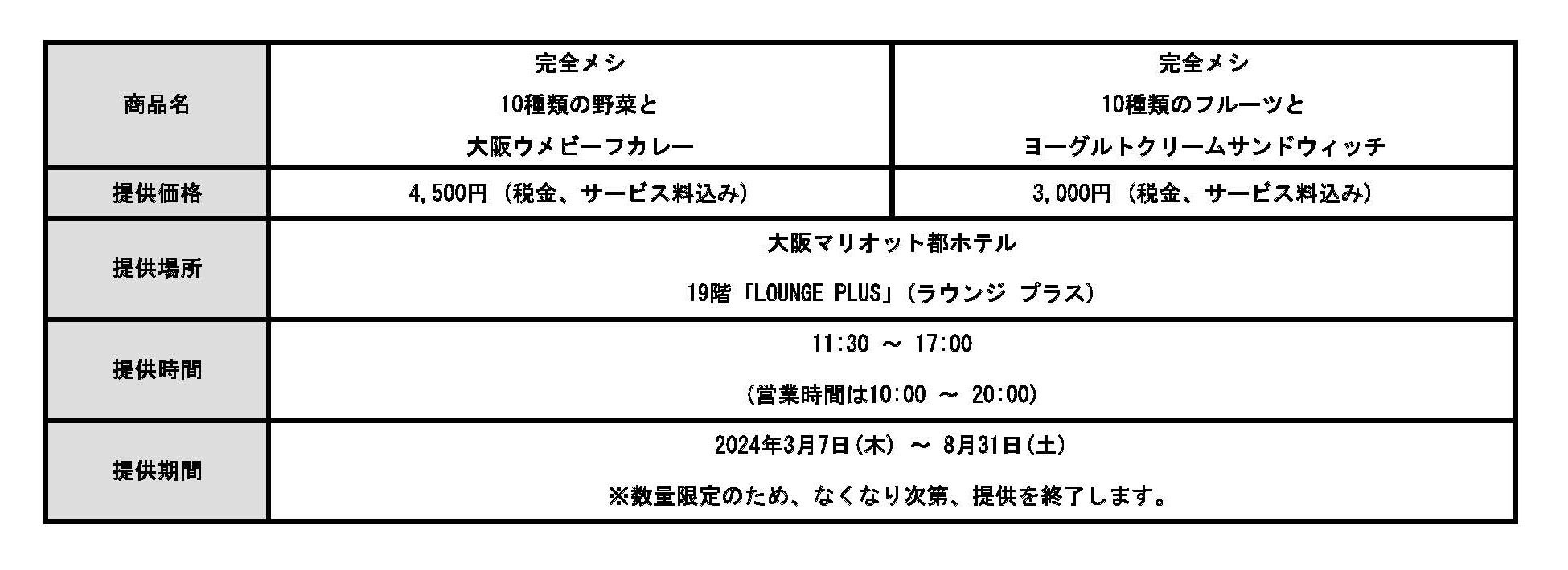 大阪マリオット都ホテル (総支配人:緒方 克美) と日清食品株式会社 (社長:安藤 徳隆) は、両社で共同開発した「完全メシ 10種類の野菜と大阪ウメビーフカレー」「完全メシ 10種類のフルーツとヨーグルトクリームサンドウィッチ」を、ホテル内レストラン「LOUNGE PLUS」(ラウンジ プラス) で3月7日(木)から提供します。