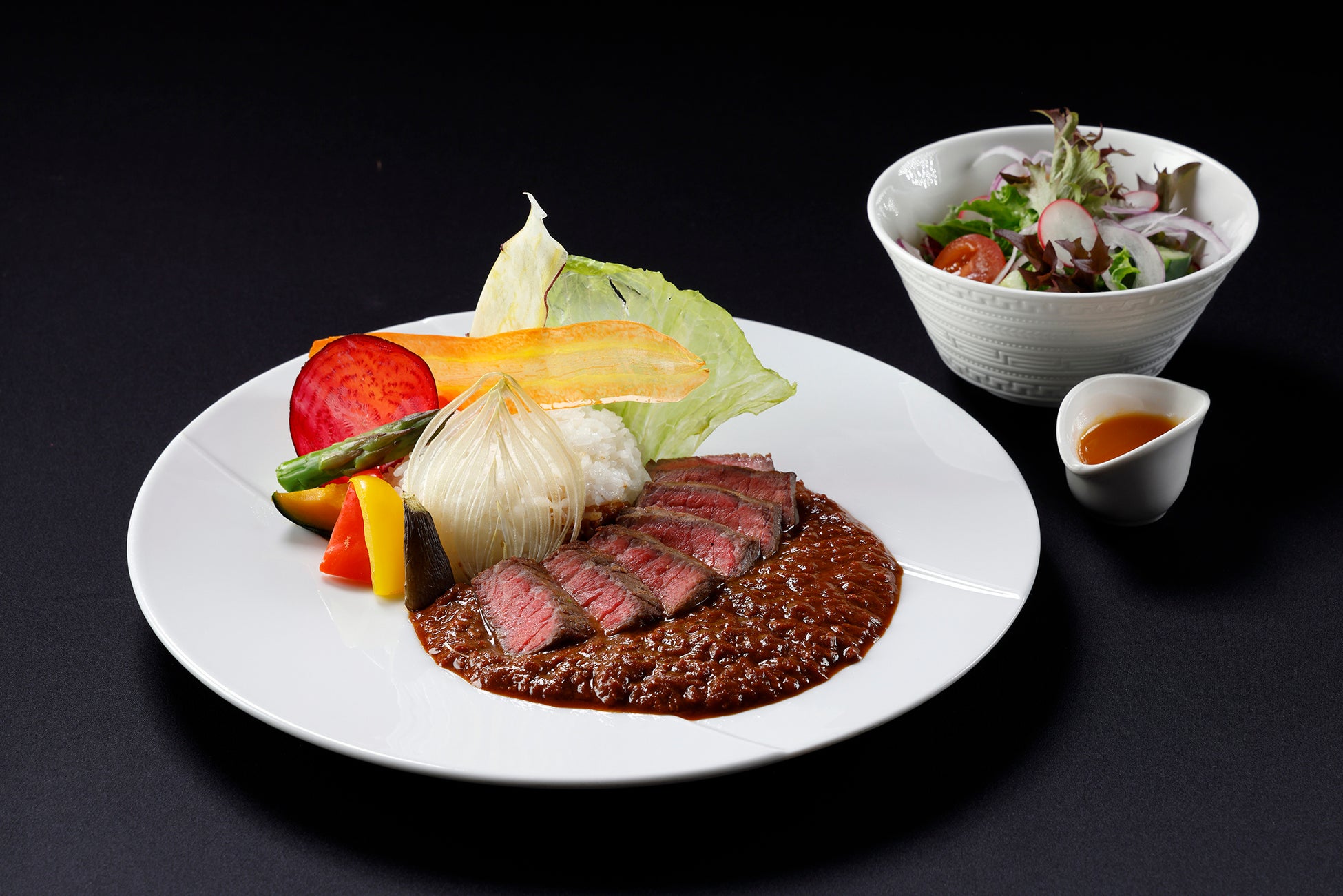 ビーフブイヨンにソテーオニオン、クミンやカルダモンなどの香り高いスパイスを加えた濃厚な味わいの欧風カレー。ライスは、京都の老舗米屋「八代目儀兵衛」が、数種類のお米をルゥの味わいに合わせて最適なバランスでブレンドしたお米を使用しました。具材は、柔らかくてジューシーな「大阪ウメビーフ」のほか、ホテル開業10周年にちなんで10種の彩り野菜 (泉州たまねぎ、ニンジン、アスパラガス、カボチャ、泉州水なす、赤パプリカ、黄パプリカ、サツマイモ、キャベツ、ビーツ) を添えました。