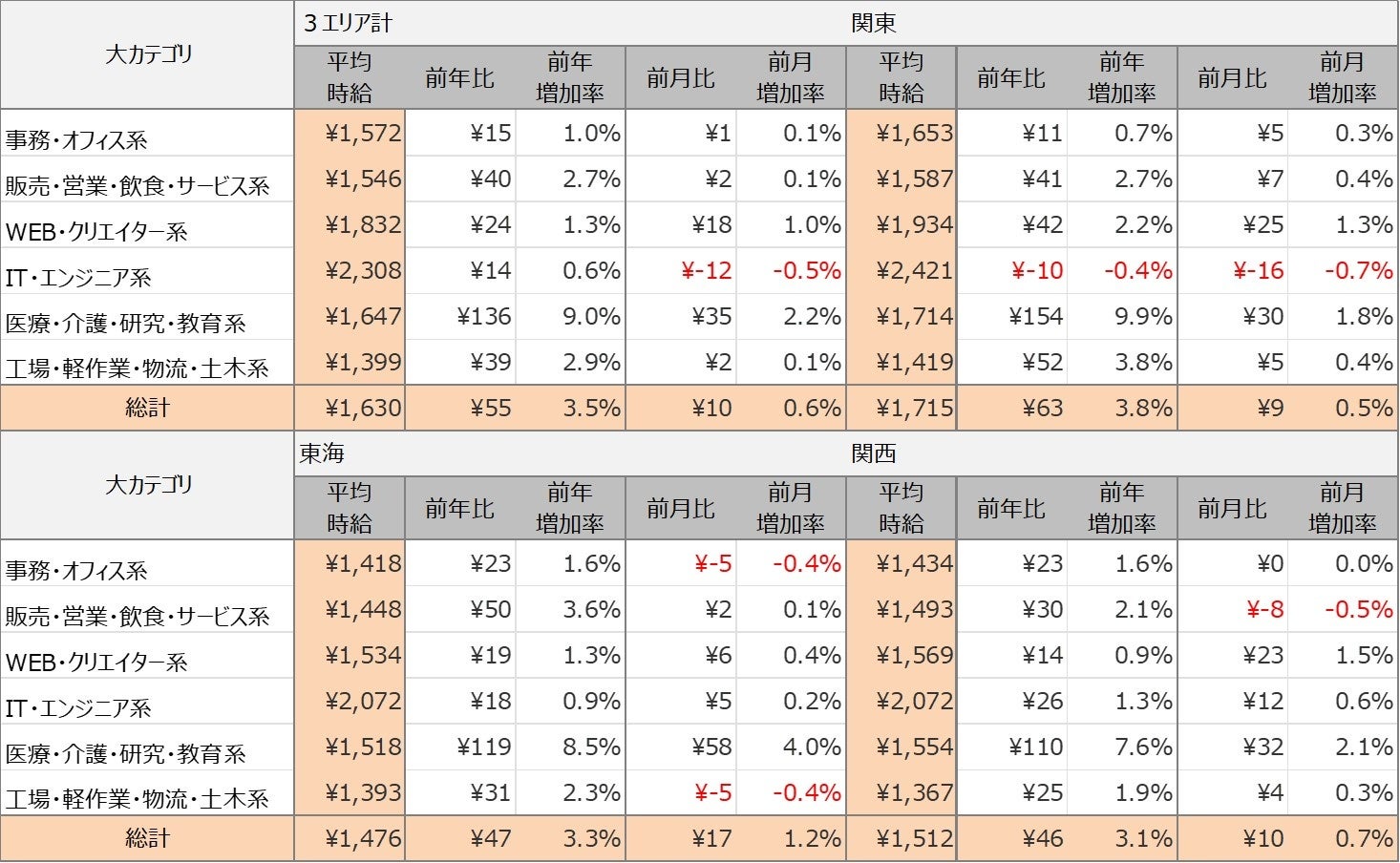 各エリアの平均時給について、関東エリアは1,715円(前年比63円増、前月比9円増)、東海エリアは1,476円(前年比47円増、前月比17円増)、関西エリアは1,512円(前年46円増、前月比10円増)となりました。