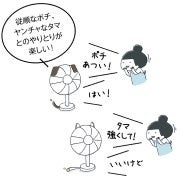 ポチとタマが応える音声機能付きなので、ペットに話しかけるように指示を出すと作動します。たとえばスイッチを入れる時のお願いワードは「あつい」。するとポチモードなら「はい」と返事が返ってきます。タマモードなら「あついね」と応答。従順なポチとヤンチャなタマとのやりとりを楽しめます。料理や洗い物で手が離せない時にも便利です。独自技術でやさしい風から力強い風まで生み出し扇風機としての機能も充実しています。