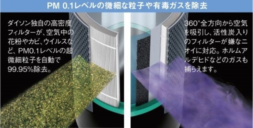 カビや花粉、超微細なPM0.1レベルの微粒子まで除去し、心地よい風を生むファン。スタイリッシュでインテリア性の高いデザイン。グラスHEPAフィルターと活性炭フィルターを組み合わせた、ダイソン独自の高密度フィルターを搭載しており、カビや花粉、超微細なPM0.1レベルの微粒子まで、除去します。