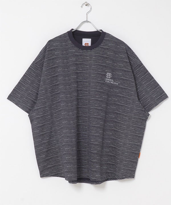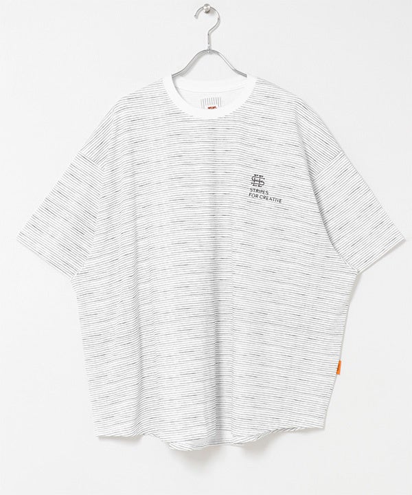 新柄のボーダーをプリントした定番のビッグシルエットのROUND TEE。素材は30SのMVS(毛羽の少ない糸)を使用し引き揃えて編むことでハリ感を持たせた、しっかりとした厚手の天竺です。SEE SEE × S.F.C ロゴ刺繍入りです。