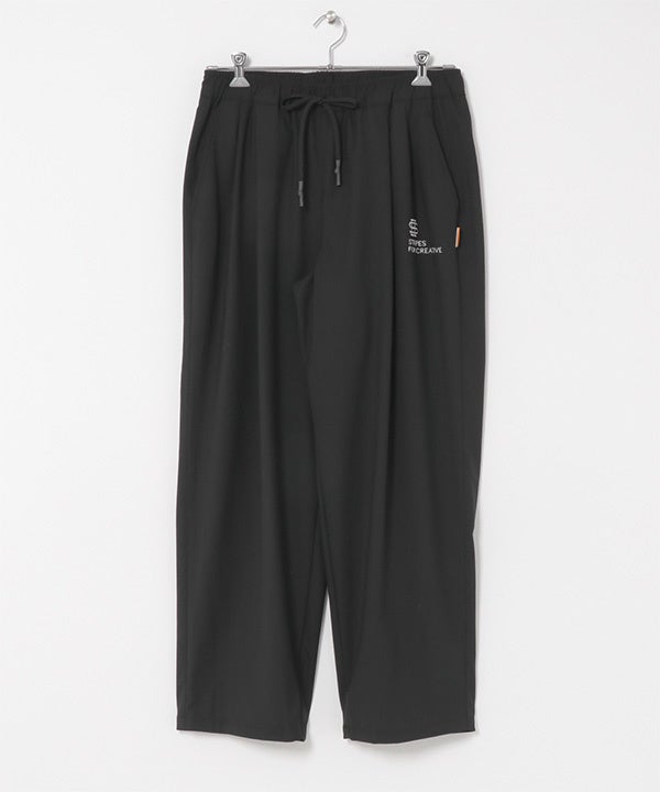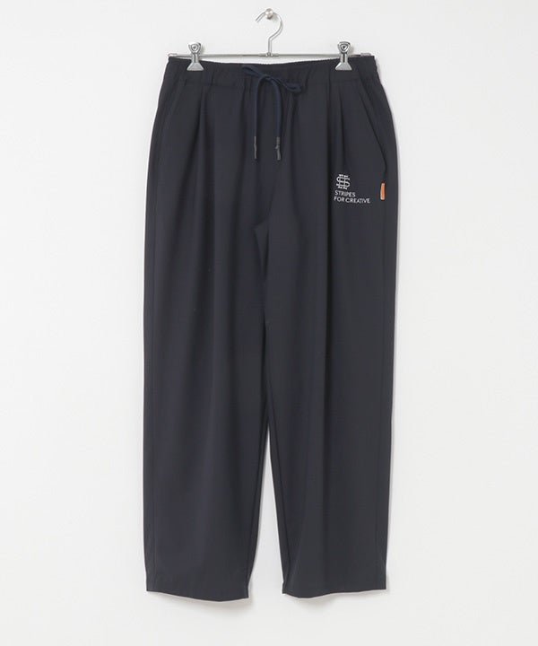 腰回りやワタリは太めに設定しながら少しテーパードをかけたすっきりしたシルエットのツータックワイドパンツ。素材はナチュラルストレッチをもったウール混生地を使用。ウール素材特有の快適な着心地とハリのある風合いを持ちながら、2WAYストレッチ、ウォッシャブル、防シワ性を併せ持った機能素材です。SEE SEE × S.F.C ロゴ刺繍入りです。