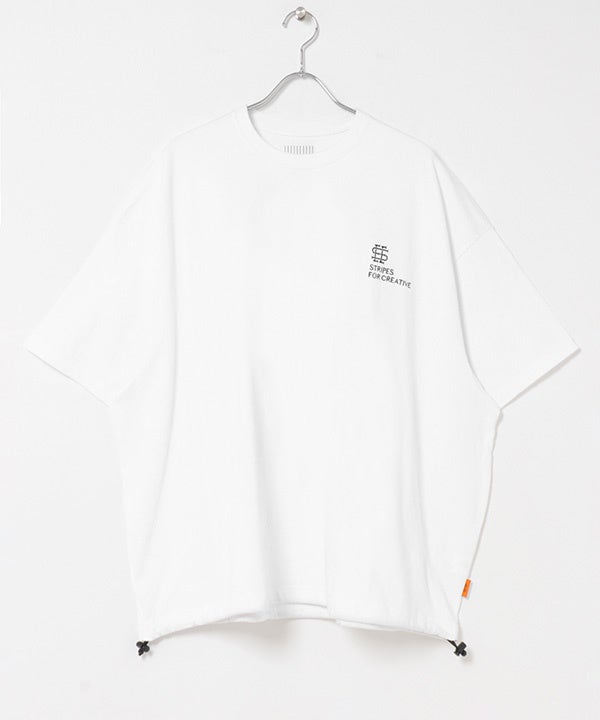 SEE SEE × S.F.Cのコラボロゴ刺繍入りビッグシルエットのドローコード付きFLAT TEE。素材は30SのMVS(毛羽の少ない糸)を使用し引き揃えて編むことでハリ感を持たせた、しっかりとした厚手の天竺です。