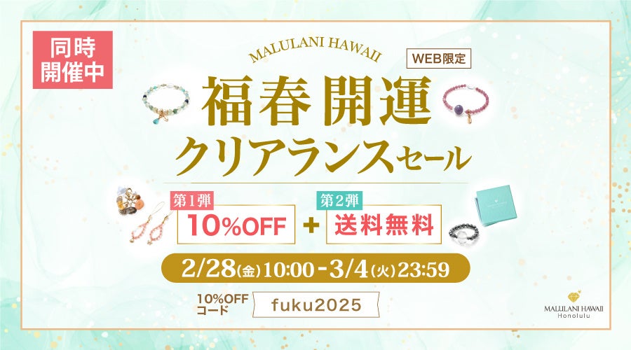 【10%OFF+送料無料】2/28-3/4 "福春開運 クリアランスセール" 第一弾&第二弾 ハワイ発パワーストーンブランド マルラニハワイにて同時開催中!
