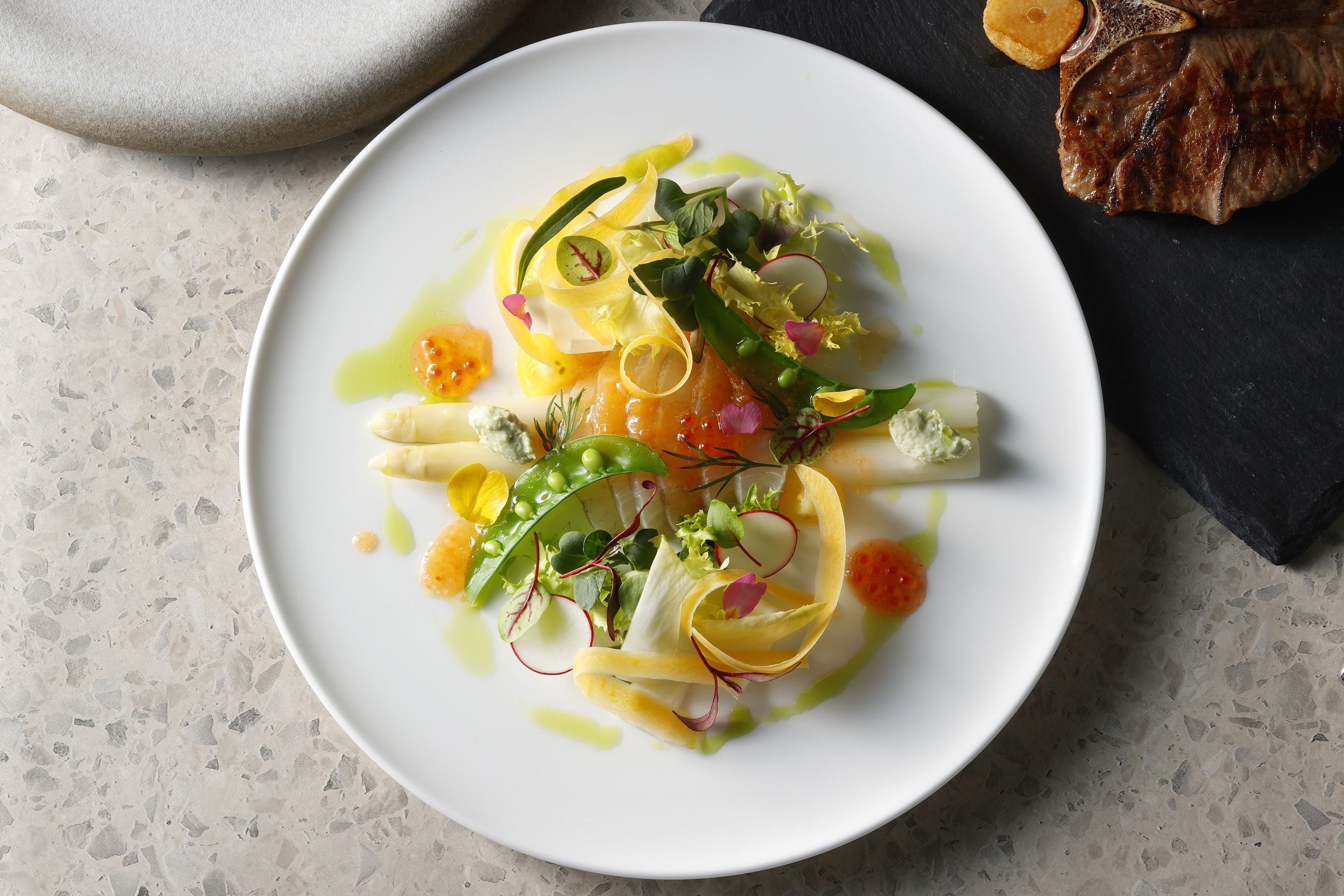 素材の良さをシンプルに活かしたグリル料理に季節を感じる食材を合わせてお届けするシグネチャーディナー。今春は山菜やハマグリなど春らしい食材を取り入れた、全4品のコースをご提供いたします。前菜は桜色が目を引く真鯛とホワイトアスパラガスをはじめとした、色鮮やかな春野菜にふきのとうの香りをまとわせた一品を。魚料理は豪快にグリルしたオマール海老に、ハマグリや桜エビといった春を象徴する魚介のソースを添えてご用意いたします。メインディッシュはさっぱりとした肉質の仔牛のTボーンステーキのグリルを、鮮やかなグリーンが目を引く山菜のサルサヴェルデソースとともにお召し上がりいただきます。