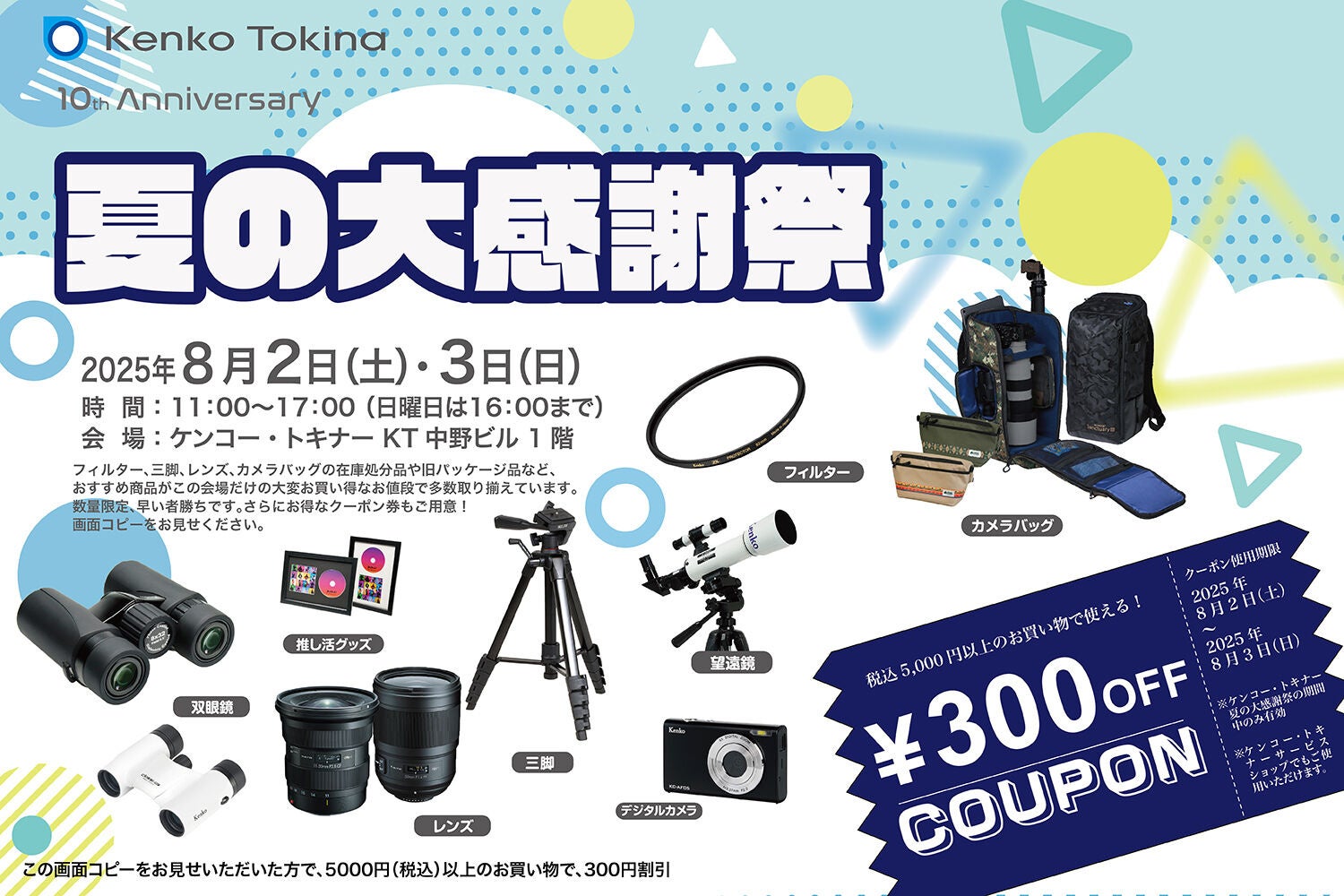 株式会社ケンコー・トキナー(本社:東京都中野区 代表取締役社長:櫻井 匡)は、2025年8月2日(土)・3日(日)、ケンコー・トキナー KT中野ビルにて『夏の大感謝祭』を開催いたします。