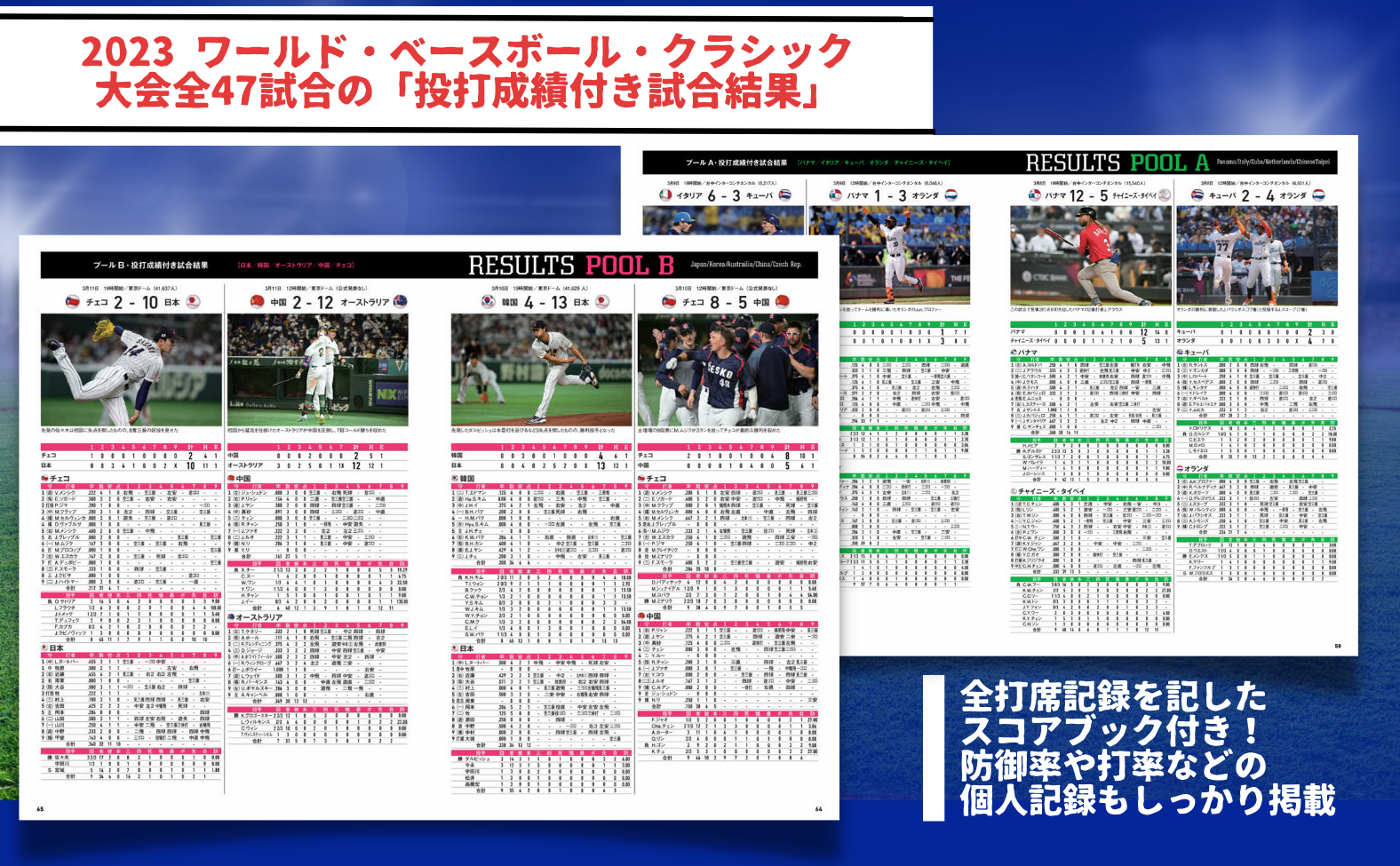 1次ラウンドから決勝まで、WBC2023・全47試合の「投打成績付き試合結果」を掲載!全打席記録を記したスコアブック付き!防御率や打率などの個人記録もしっかり掲載しています。