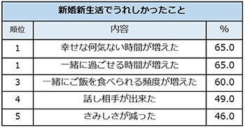 新婚時の新生活でうれしかったことの質問では、「幸せな何気ない時間が増えた」と「一緒に過ごせる時間が増えた」が同率65%の1位で、具体的な物事よりも新婚生活そのものを楽しんでいることがわかりました。