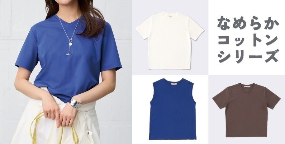 1枚でもインナーでも重宝する「なめらかコットンシリーズ」が登場。綿100%ながらシルクのような艶と、なめらかな肌ざわりが魅力です。計算されたシルエットが首元や腕まわりをすっきりと見せ、日常からお仕事まで上品に決まる頼れるアイテムです。