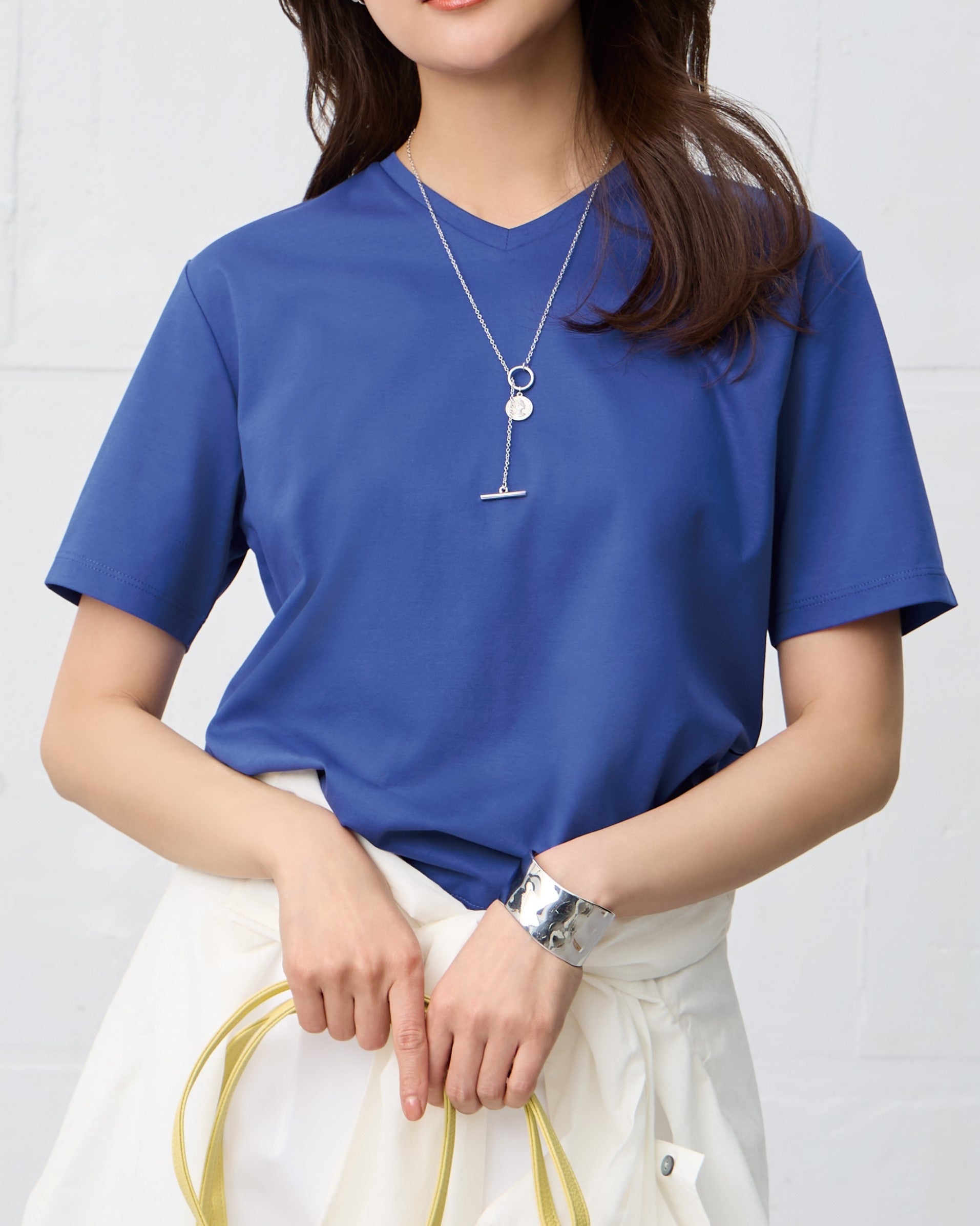 首元をすっきりと見せるVネックラインが特徴。腕まわりがスマートに見える袖丈で、1枚でも、ジャケットのインナーとしても重宝します。