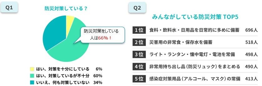 ※食料品の備蓄や防災リュックの準備など、なんらかの防災対策をしている人は66%。一方で、防災対策を不十分だと感じている人は94%!
