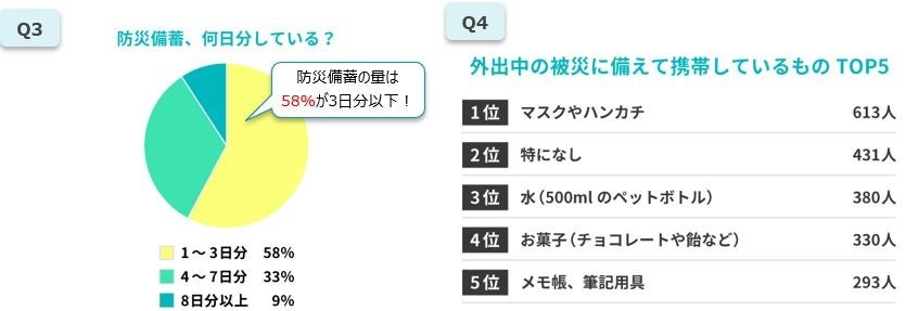 ※ 最低1週間分以上はストックしておきたいと言われる防災備蓄については、58%が3日分以下という結果に。