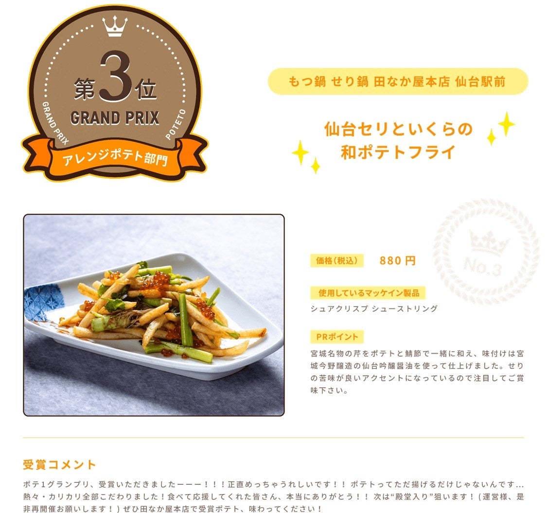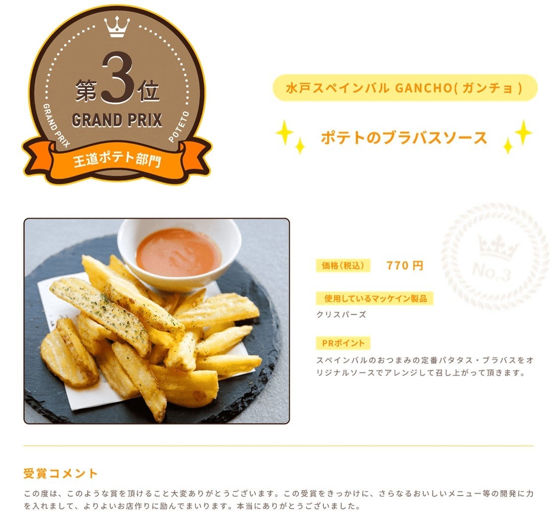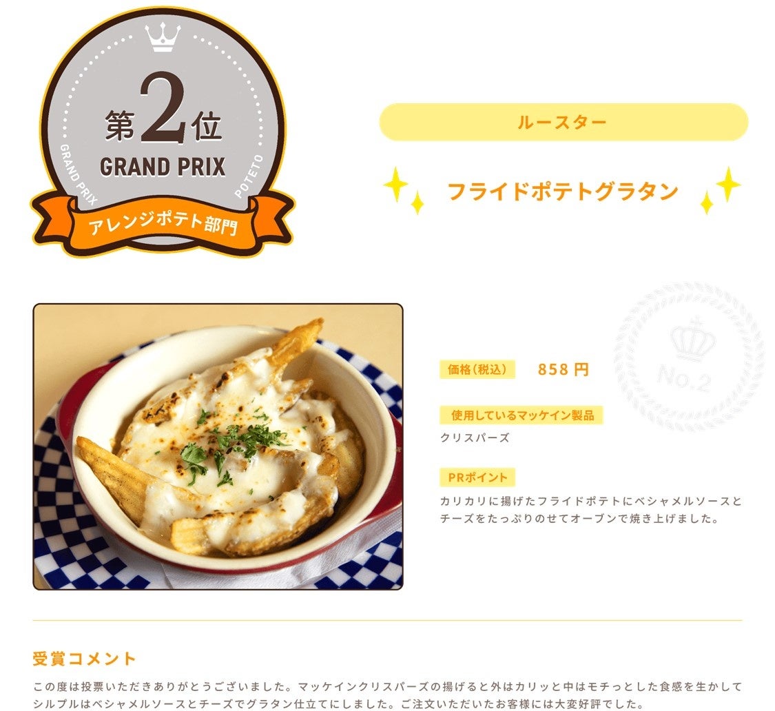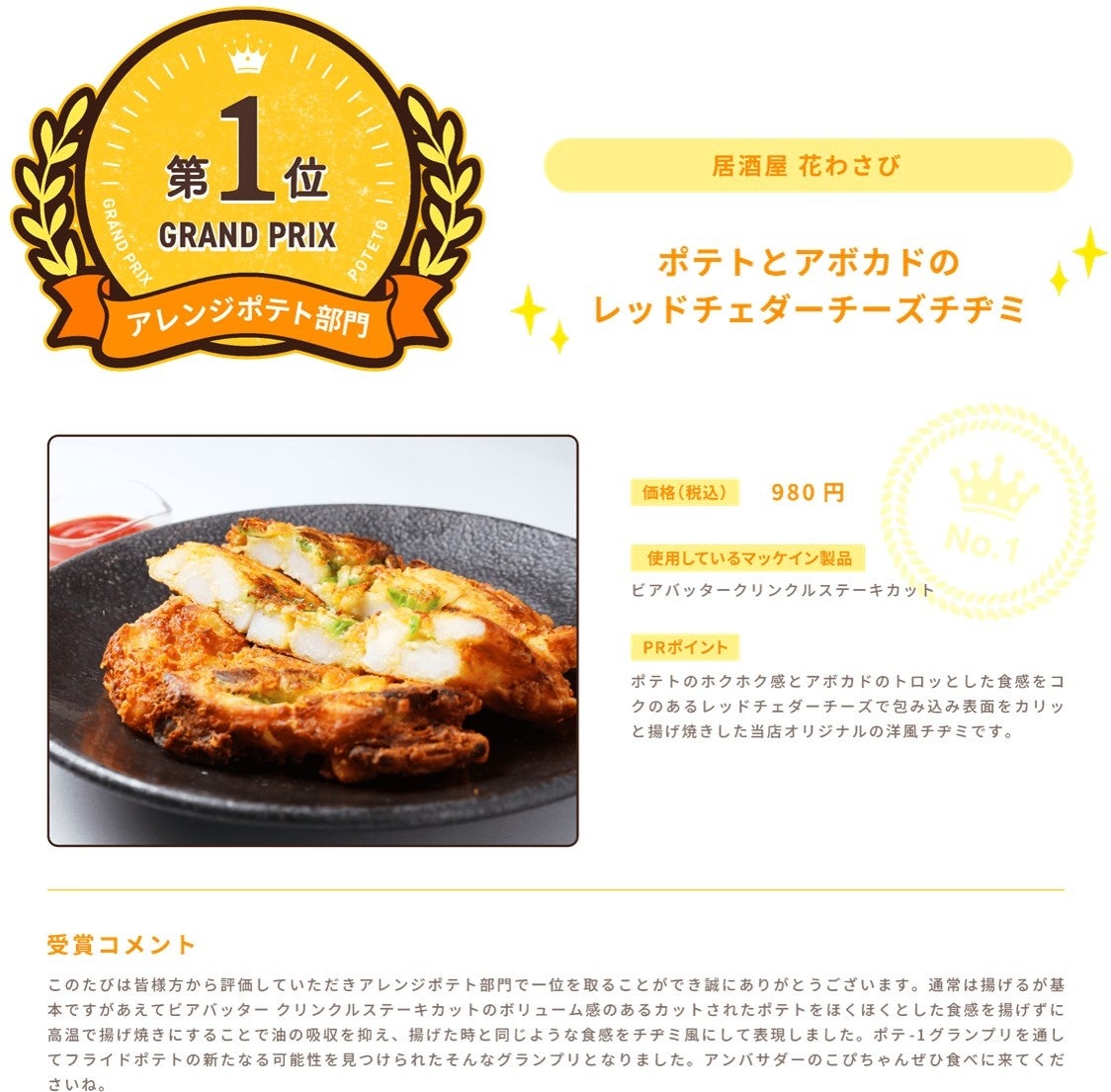 本グランプリは、全国の飲食店100店舗が、「王道ポテト部門」(フライドポテトそのままのおいしさが楽しめるディップ系メニュー)と「アレンジポテト部門」(フライドポテトにソースや具材を加えてアレンジしたメニュー)に分かれ、世界最大級のフライドポテト・メーカーであるマッケインの製品を使用したオリジナルメニューでエントリーしました。グランプリ結果とポテ-1グランプリ アンバサダーのこぴが独自の視点で選んだこぴ映え賞は下記の通りです。