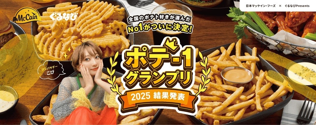 株式会社ぐるなび(本社:東京都千代田区、代表取締役社長:杉原章郎 以下、ぐるなび)と日本マッケイン・フーズ(本社:東京都港区、代表取締役社長:メロ・パブロ・ロドルフォ 以下、「マッケイン」)は、4月28日(月)から5月27日(火)まで、マッケイン製品を使用したフライドポテトメニューNo.1決定戦「ポテ-1グランプリ2025」を開催し、全国の飲食店100店舗のメニューの中から、消費者によるXでの投票で、「王道ポテト部門」(フライドポテトそのままのおいしさが楽しめるディップ系メニュー)と「アレンジポテト部門」(フライドポテトにソースや具材を加えてアレンジしたメニュー)の1位~3位が決定しました。