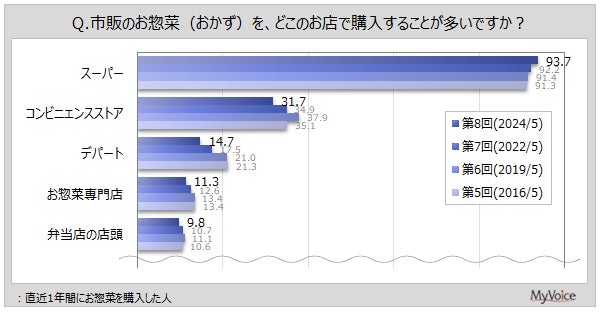 直近1年間にお惣菜を購入した人の購入場所は(複数回答)、「スーパー」が93.7%、「コンビニエンスストア」が31.7%、「デパート」が14.7%です。