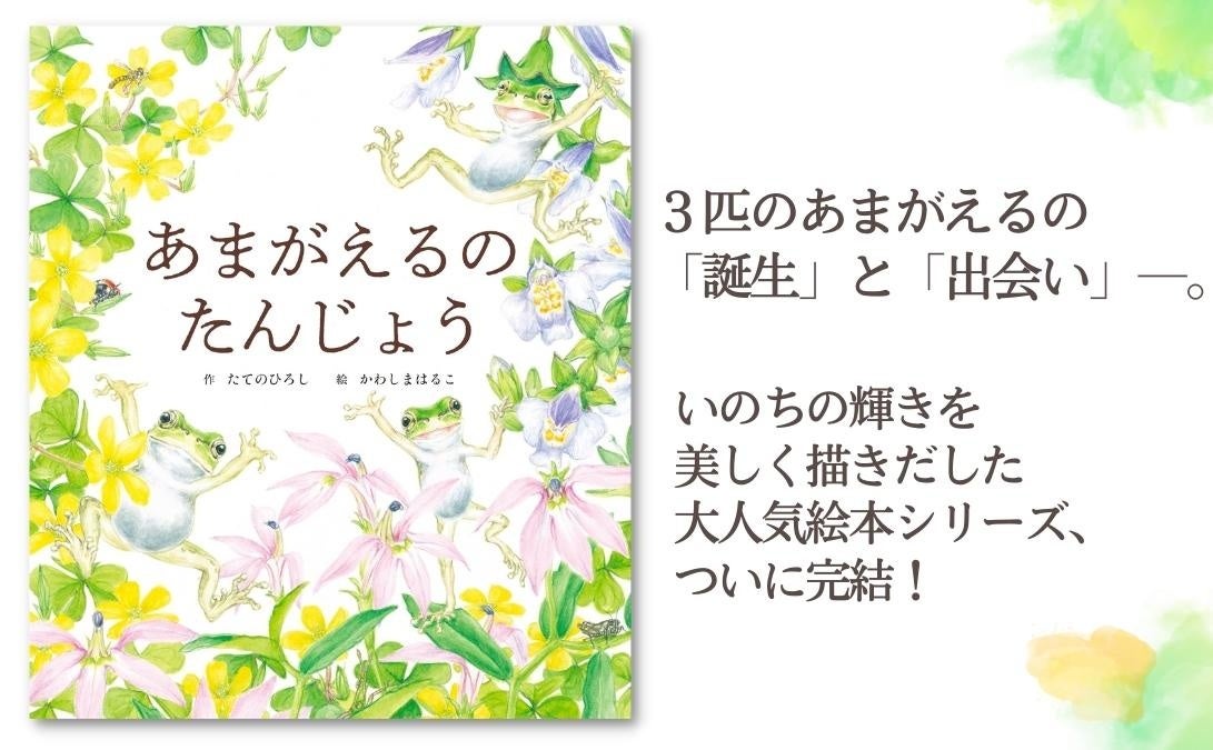 世界文化社は、「あまがえる」を題材に生物の”いのちの輝き”をみずみずしく描いた人気絵本シリーズ最新刊『あまがえるの たんじょう』を、4月27日に発売いたします。本書は、小学館児童出版文化賞受賞作家・たてのひろしが原作を手掛け、生物画家・かわしまはるこが絵を担当した絵本三部作の最後の物語です。
