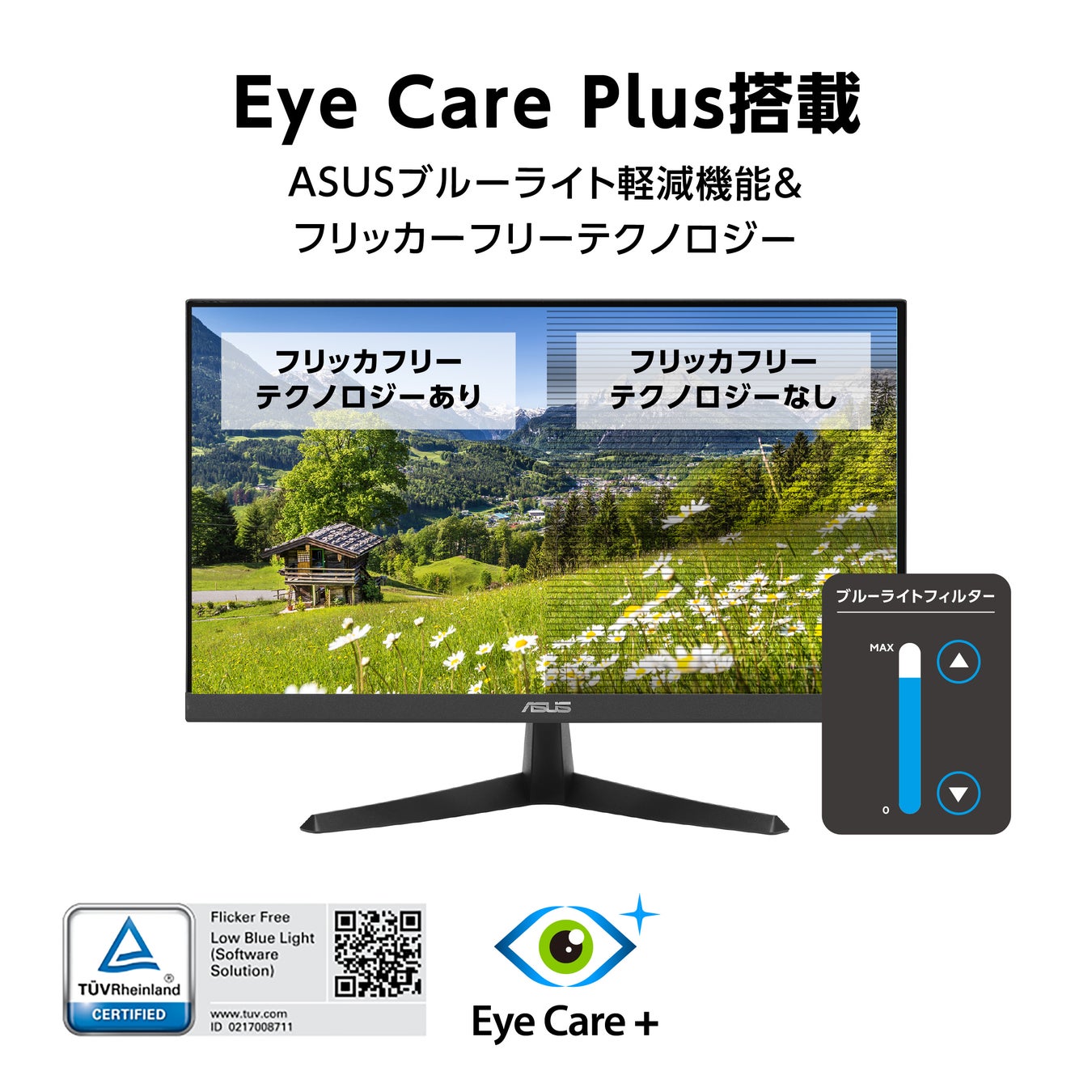 TÜV Rheinland認証を取得したASUS Flicker Freeテクノロジーを搭載した本製品は、画面のちらつきを抑えて快適な視聴環境を実現します。この技術により、モニターを長時間見続けることによる眼精疲労を最小限に抑えることができます。