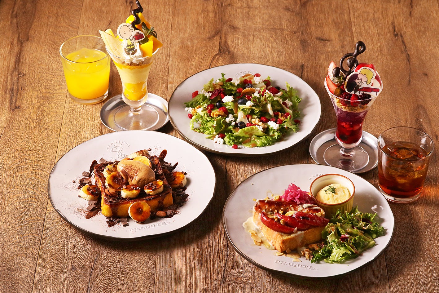 スヌーピーと仲間たちのティーパーティーをイメージしたアフタヌーンティーやPEANUTSのコミックに登場したようなサンドイッチやフレンチトーストを、PEANUTS Cafeらしくアレンジしました。PEANUTSの世界観を満喫できる店内や公園の緑を感じられる開放的なテラス席で、食べ応えのあるメニューが1日中お楽しみいただけます。