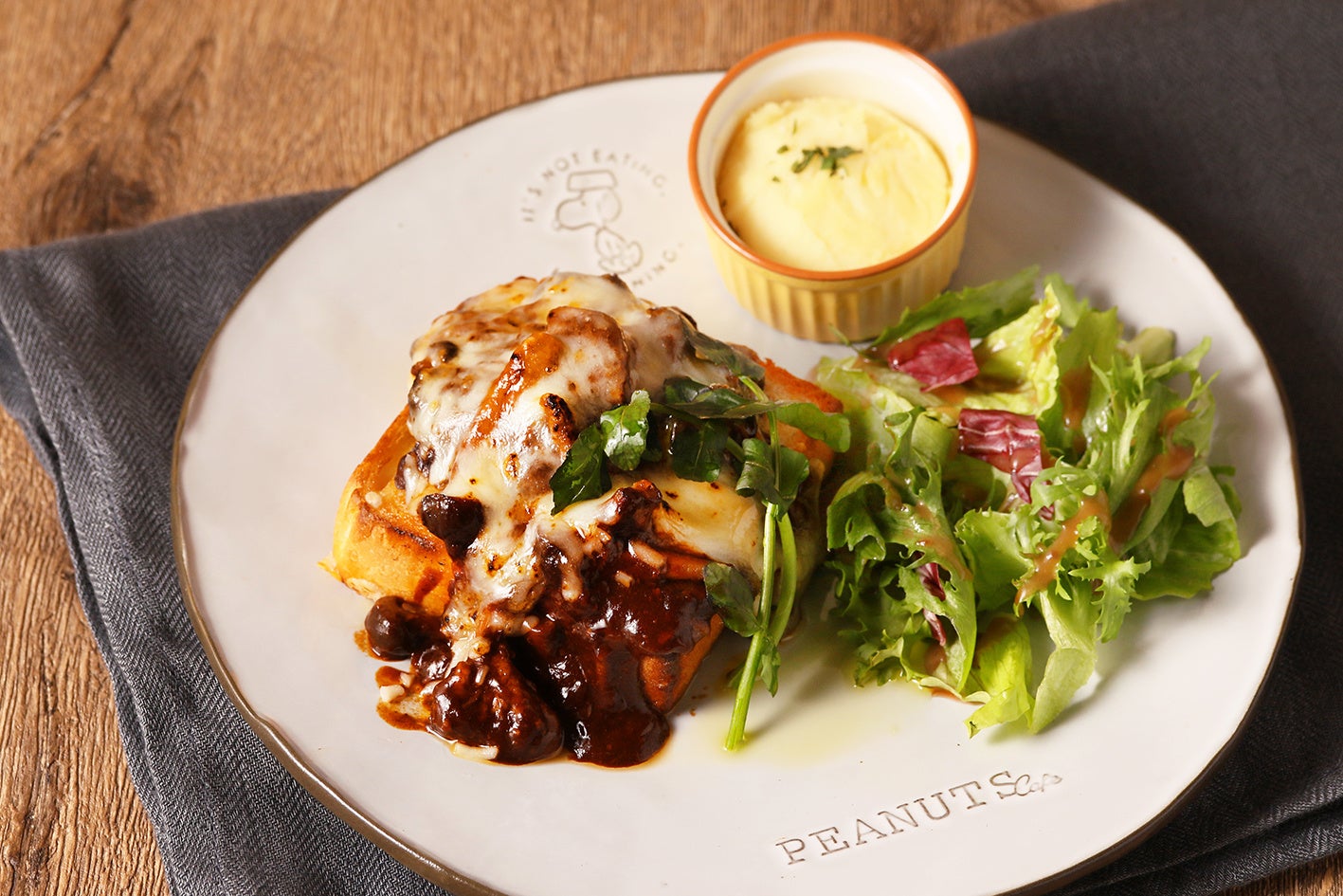 スパイスでマリネした鶏むね肉とカリっと焼いたベーコン、シャキシャキレタスやトマトでボリューム満点のトースト。とろーり卵をたっぷり絡めて、ナイフとフォークでパクリ!が、PEANUTS Cafeだけの楽しみ方。