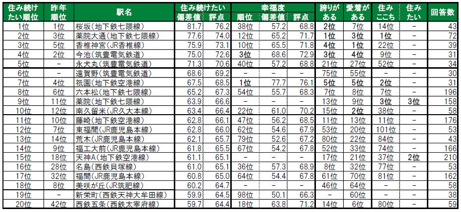 福岡市中央区に位置する桜坂が、唯一偏差値80台の極めて高い評価を得て、4年連続で1位に輝きました。2位は福岡市中央区に位置する薬院大通(昨年3位)、3位は福岡市東区に位置する香椎神宮(昨年5位)です。その他トップ10内で初登場の駅は、5位永犬丸、6位遠賀野で、いずれも昨年は累計回答者数が30名未満でランキングの集計対象外だった筑豊電気鉄道沿線の駅です。