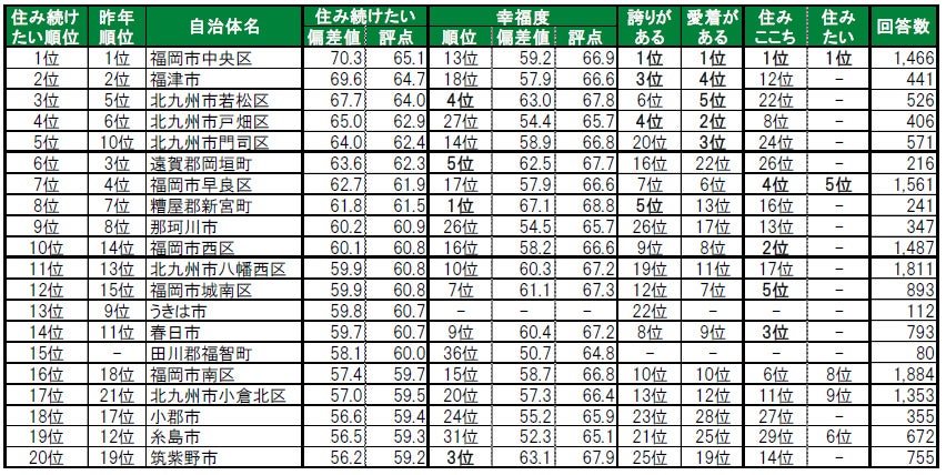 1位は2年連続で福岡市中央区で、唯一偏差値70台の高い評価を得ています。福岡市中央区は、「街に誇りがある」「街に愛着がある」「住みここち」「住みたい街」でも1位となる高い評価を得ている街です。2位は2年連続で福津市、3位は昨年5位から順位を上げた北九州市若松区です。その他トップ10内では、4位北九州市戸畑区(昨年6位)、5位北九州市門司区(昨年10位)など、北九州市の行政区が昨年よりランクアップし、トップ5にランクインしています。