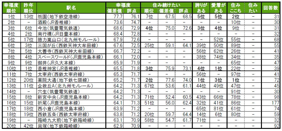 福岡市博多区に位置する祇園が、昨年13位から順位を上げて1位に輝きました。2位は初登場の糟屋郡粕屋町に位置する酒殿で、昨年は累計回答者数が30名未満でランキングの集計対象外でした。3位は北九州市八幡西区に位置する今池で、昨年6位から順位を上げました。その他トップ10内では、徳力嵐山口が、昨年17位から大きく順位を上げて5位となっています。