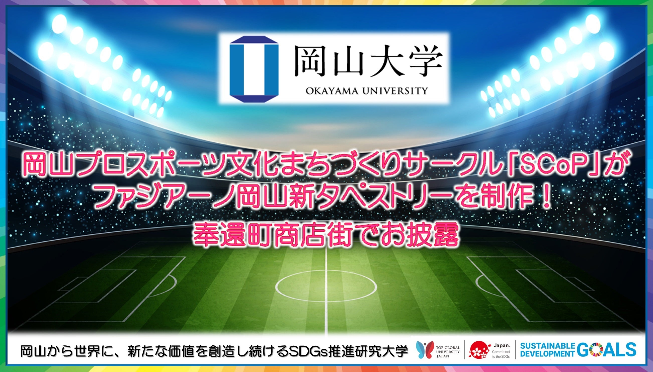 国立大学法人岡山大学(本部:岡山市北区、学長:那須保友)は、岡山大学公認岡山プロスポーツ文化まちづくりサークル「SCoP(スコップ)」が、奉還町商店街に掲出している「ファジアーノ岡山タペストリー」の10周年を迎えるのに際し、新しいデザインのタペストリーを制作しました。2023年6月3日のファジアーノ岡山ホームゲームに合わせて除幕式が開催され、2枚の新タペストリーをお披露目しました。