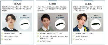 ■丸顔:長めのアーチ眉 ■卵型:斜め直線眉 ■面長:太めの平行眉 ■逆三角形:柔らか平行眉 ■ベース型:角度のある眉
