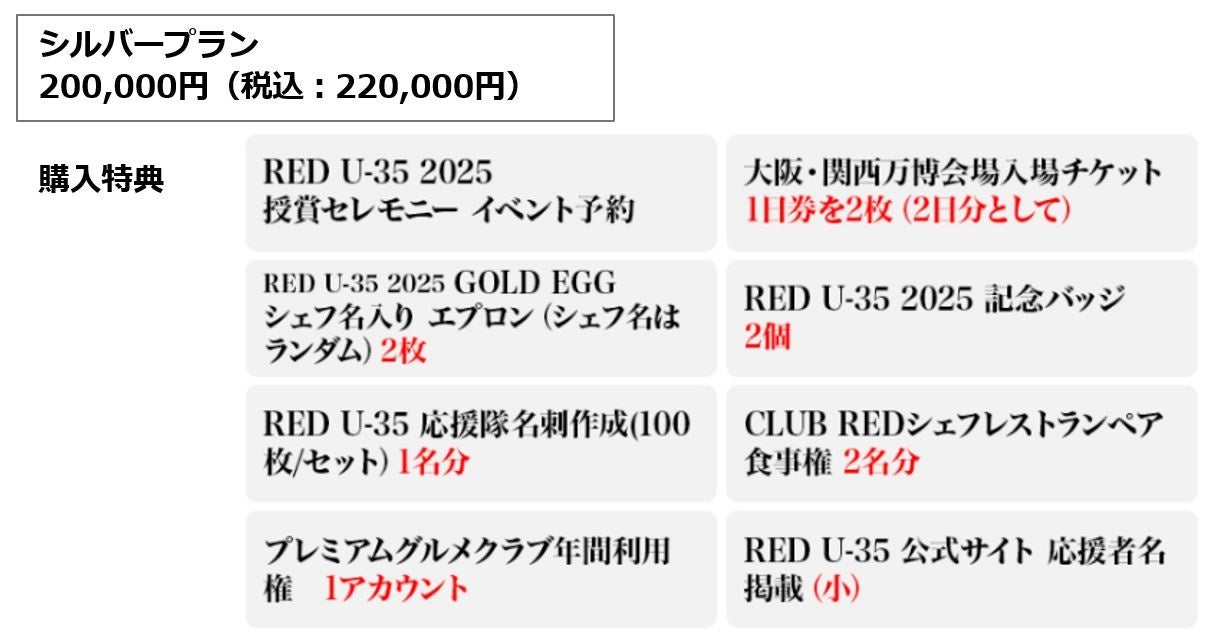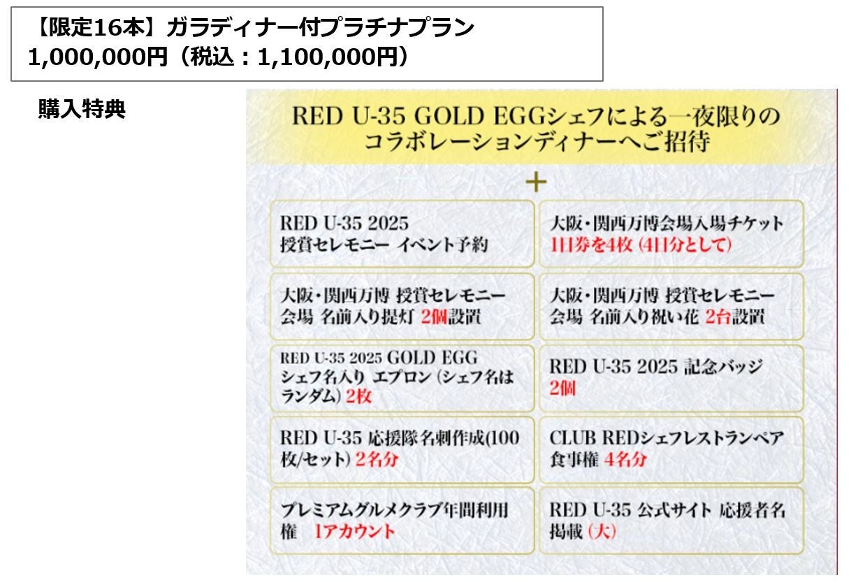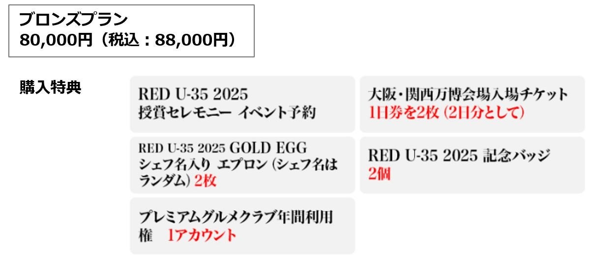 また、全プランに、大会授賞セレモニーに参加できる大阪・関西万博入場チケットが付いており、プラン内容によっては、RED U-35 で入賞した「CLUB RED」シェフのレストランのお食事券などが特典となっています。