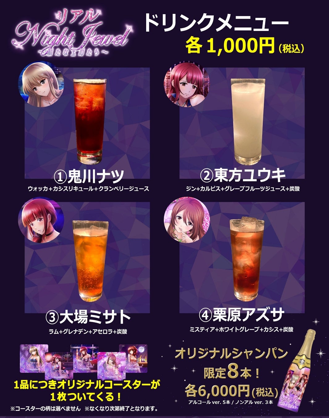 当日はキャラクター衣装に身を包んだキャストとの会話をお楽しみいただけるほか、アルコールを含むドリンクの飲み放題や軽食をご提供いたします。オリジナルシャンパンや限定オリジナルカクテルの販売も予定しておりますので合わせてお楽しみください。