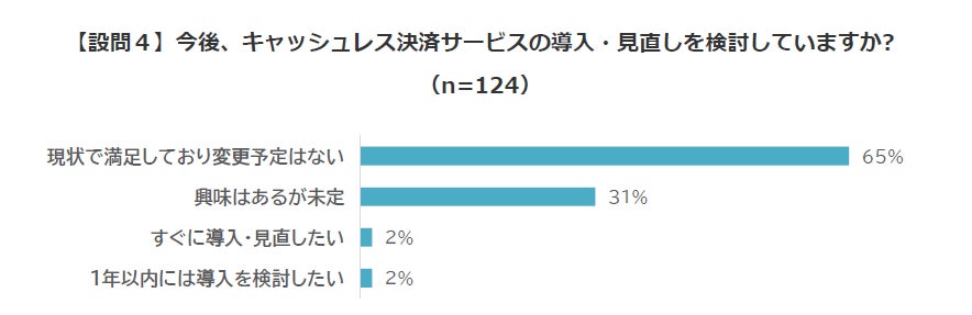 キャッシュレス決済サービスの導入・見直しについては、「現状で満足しており変更予定はない」と回答した店舗が最も多く、全体の65%を占めました。一方で「興味はあるが未定」とした店舗も約3割にのぼり、新たなサービスへの関心が見られます。「すぐに導入・見直したい」「1年以内に導入を検討したい」といった積極的な回答は少数にとどまりました。今回の結果から、多くの店舗が現在利用中のサービスに満足している一方で、今後の選択肢を探っている層も存在していることが明らかになりました。