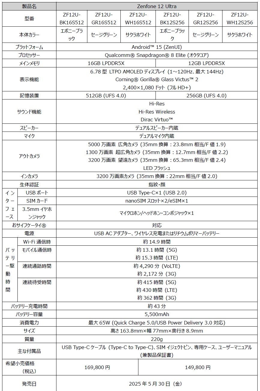 ●Zenfone 12 Ultraの製品仕様概要と発売日および希望小売価格