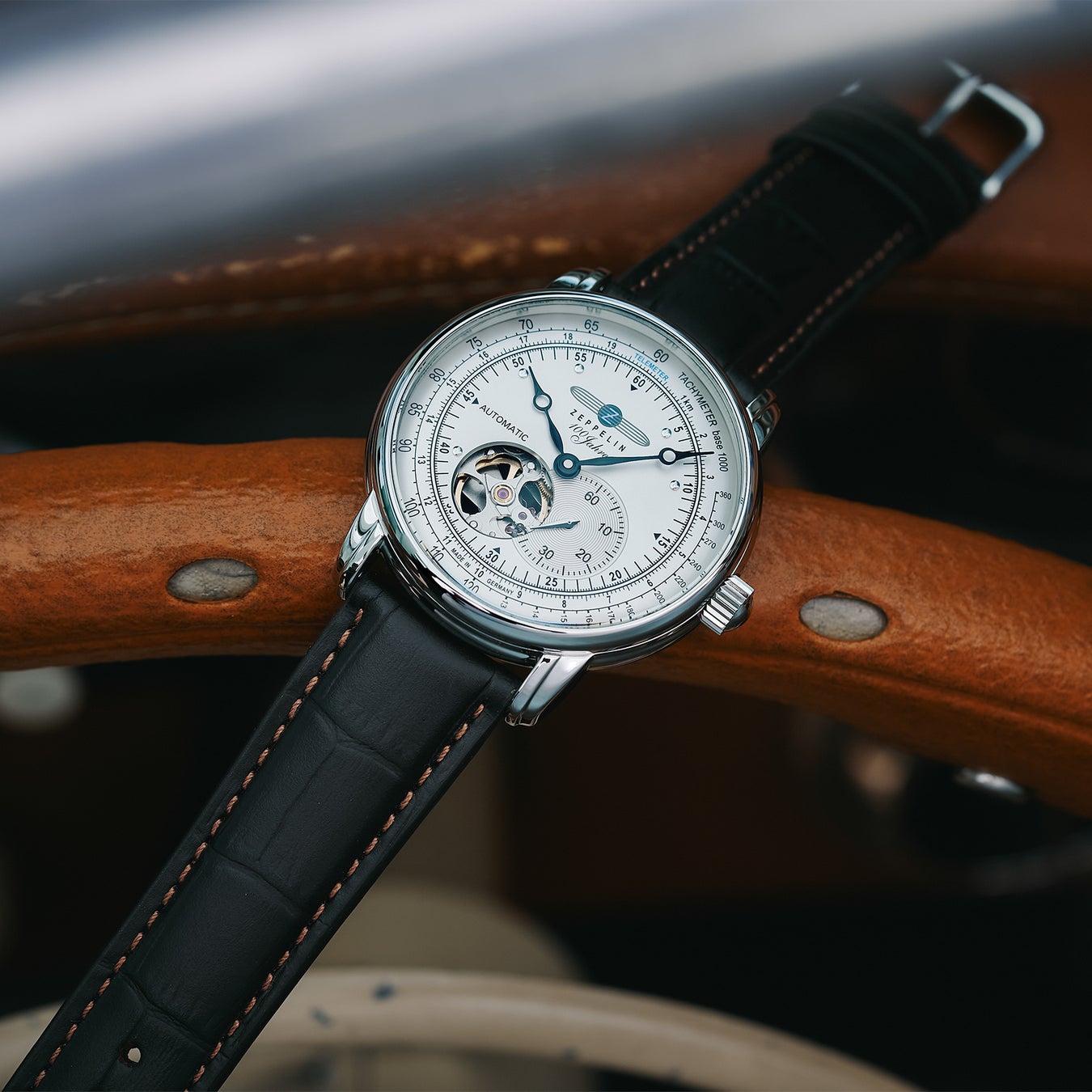 いつでも時計の心臓部の動きを堪能できるオープンハート仕様。駆動装置として採用したのは、信頼性の高い日本製自動巻きムーブメント。ダイヤルの7時位置を円形にくり抜き、そこから時計の心臓部であるテンプの動きを楽しめます。5時位置には、オープンハートと重なるようにしてスモールセコンドを配置。外周に刻印されたタキメーターとテレメーターは、飛行船としての存在感を高めています。