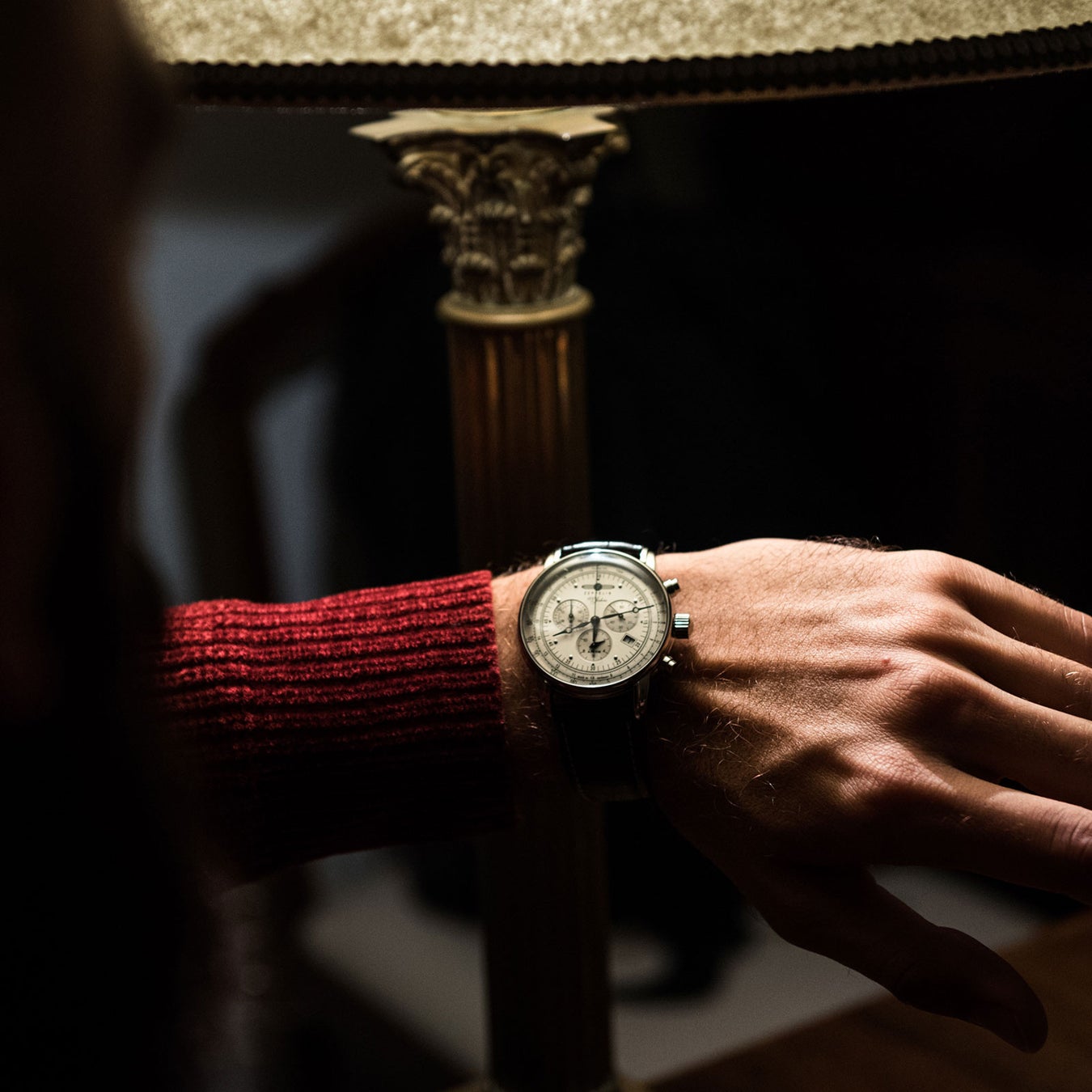 計測機能を備えたクロノグラフは、精密機器としての魅力を詰まった時計のひとつ。「日本限定クロノグラフ」もそうした魅力を秘めながら、伝統的な装飾を基調とすることで抑制的で理知的な表情を生んでいます。
