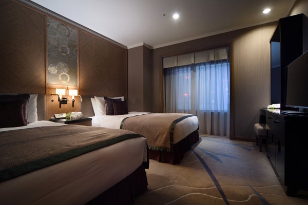 ベッドがツインタイプのアンバサダースイート。 快適なバスタイムのために、レインシャワーに加えてテレビをご観賞いただけます。