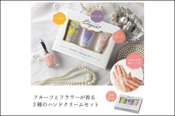 フローラルフレーバーが香る保湿ハンドクリームのセット。シトラス・ラベンダー・ローズの香りをお楽しみいただけます。